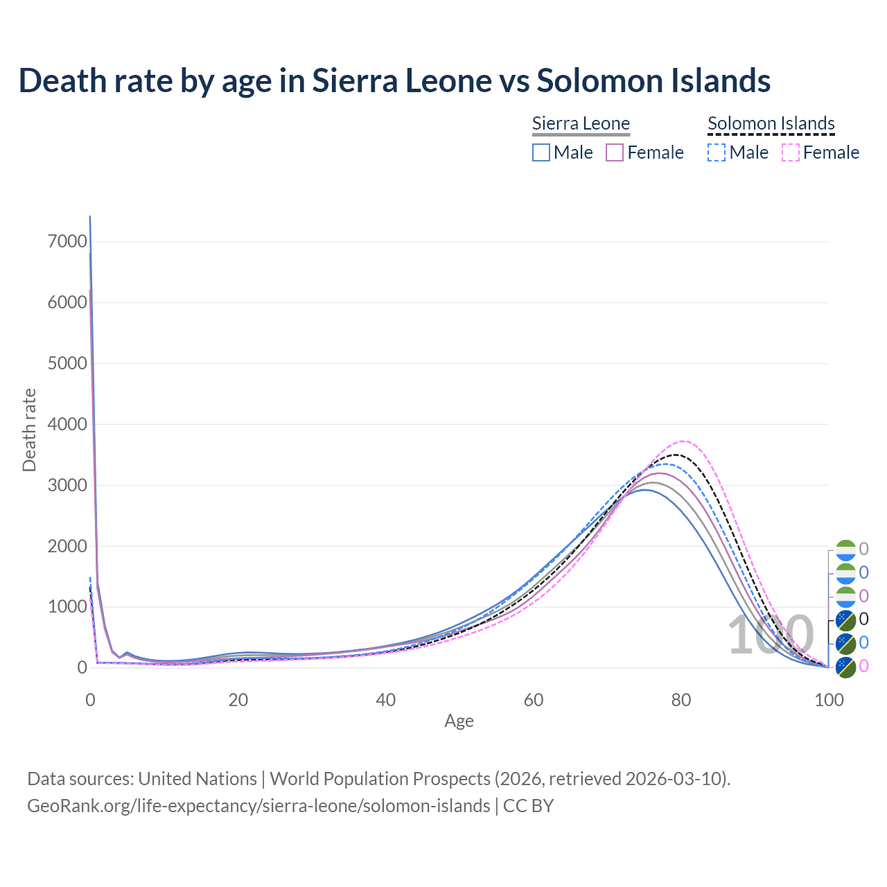In Sierra Leone, the most common age of death is 0, compared to 79 in the Solomon Islands. The median age of death is 70.8 in Sierra Leone and 74.9 in the Solomon Islands, meaning only half of each cohort is expected to live past that age.
