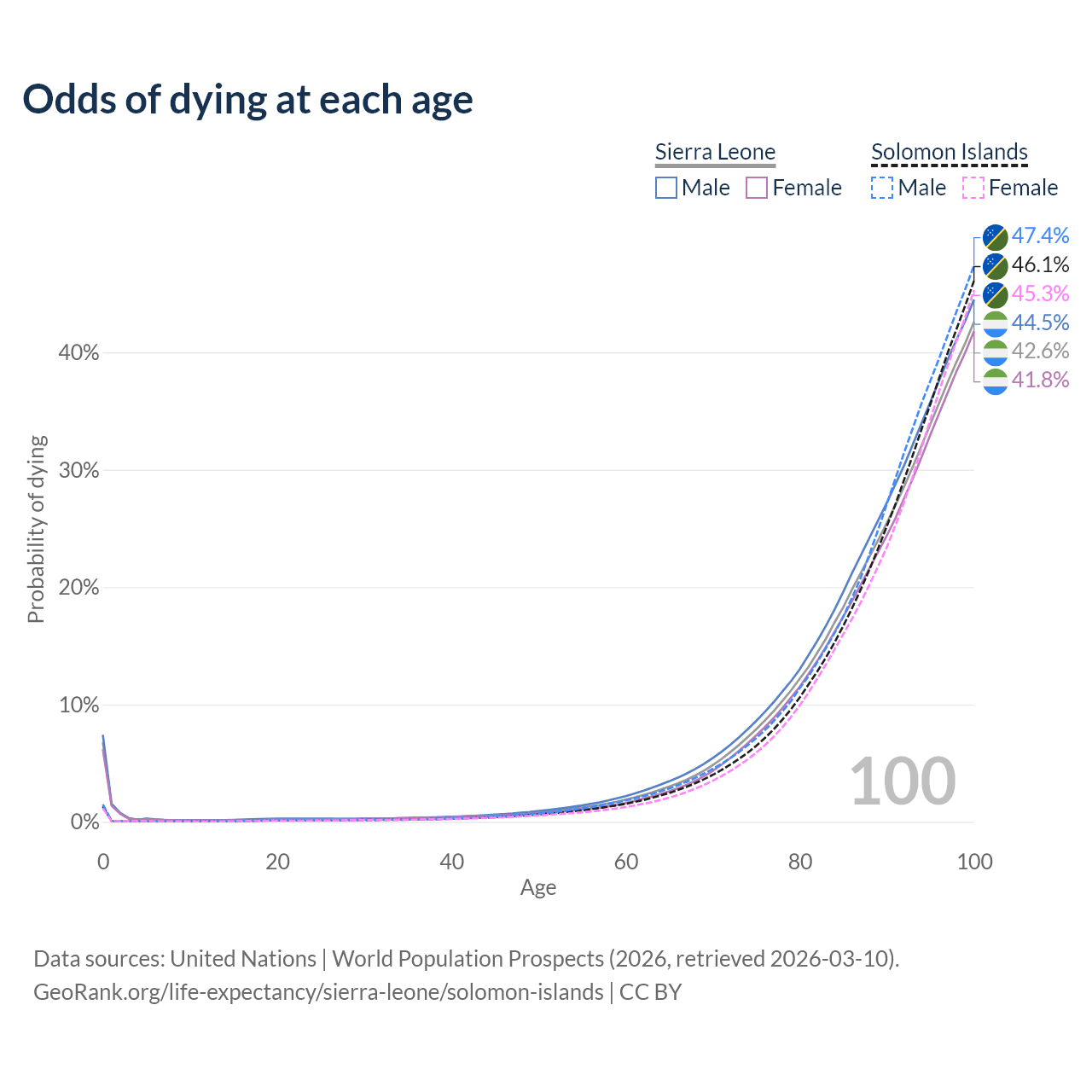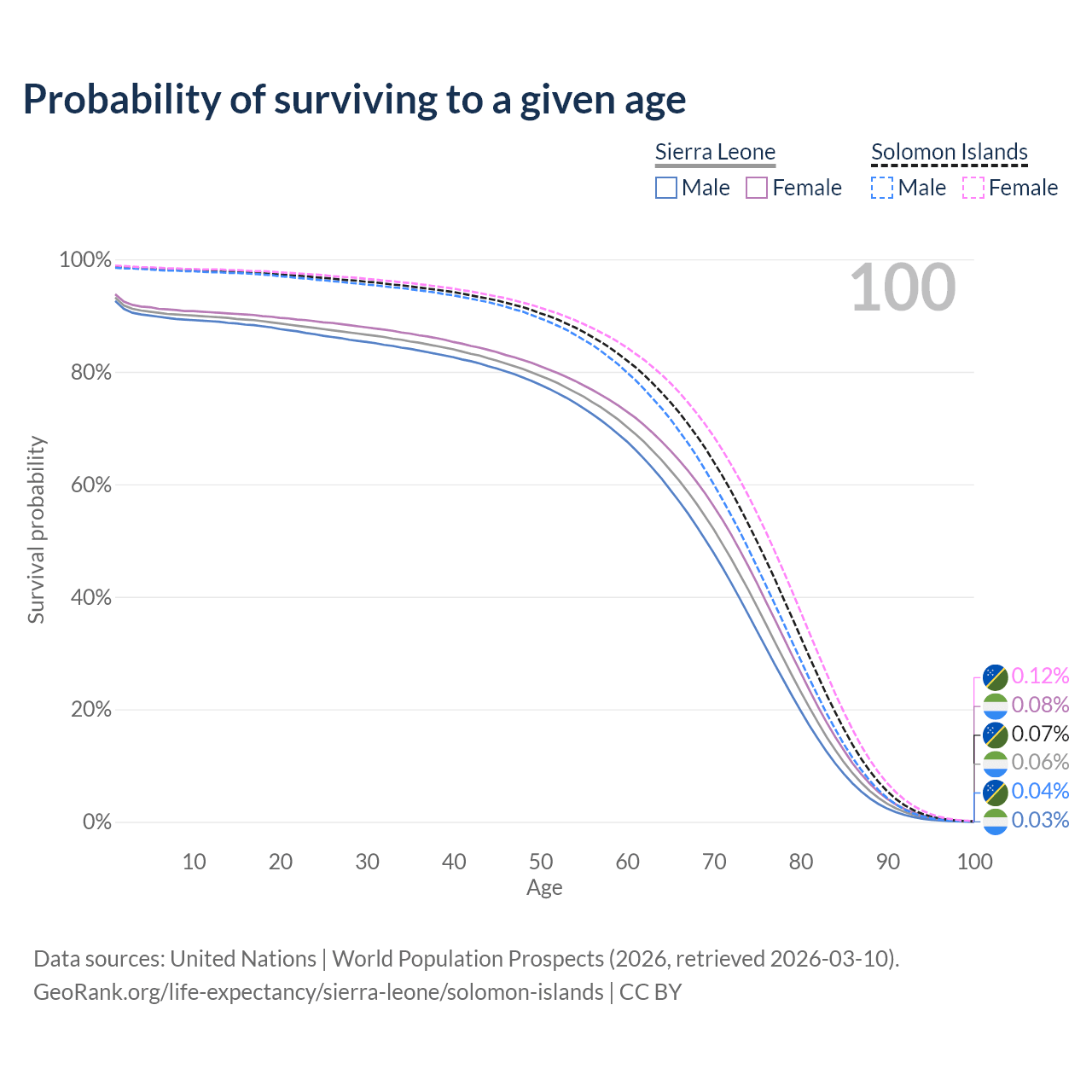 This life expectancy calculator shows the odds of living to 100, 95, 90, and below based on current age for both males and females in Sierra Leone and the Solomon Islands, along with mean and median age of death. The calculations are based on the 2026 life tables (actuarial tables) from the UN World Population Prospects.