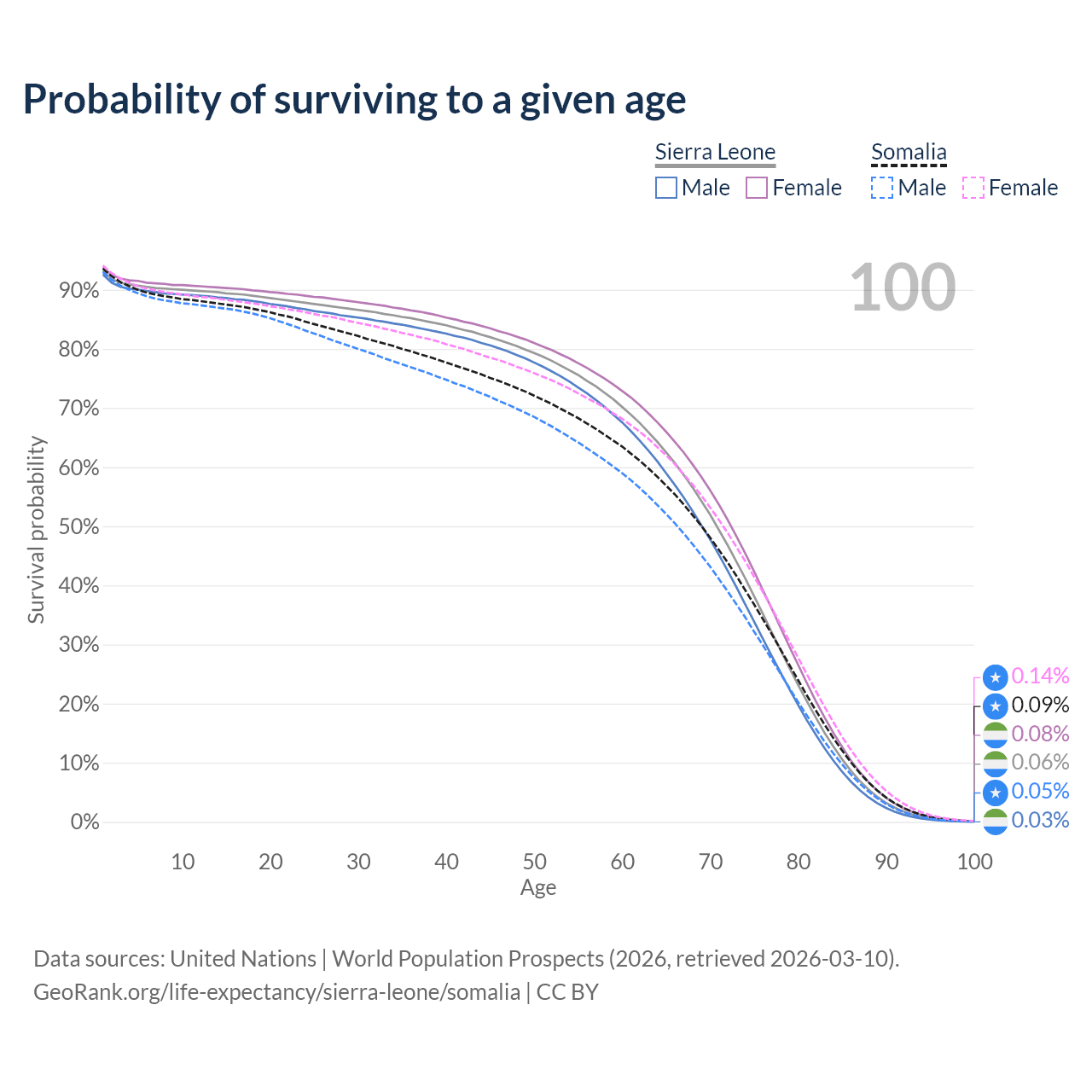 This life expectancy calculator shows the odds of living to 100, 95, 90, and below based on current age for both males and females in Sierra Leone and Somalia, along with mean and median age of death. The calculations are based on the 2026 life tables (actuarial tables) from the UN World Population Prospects.