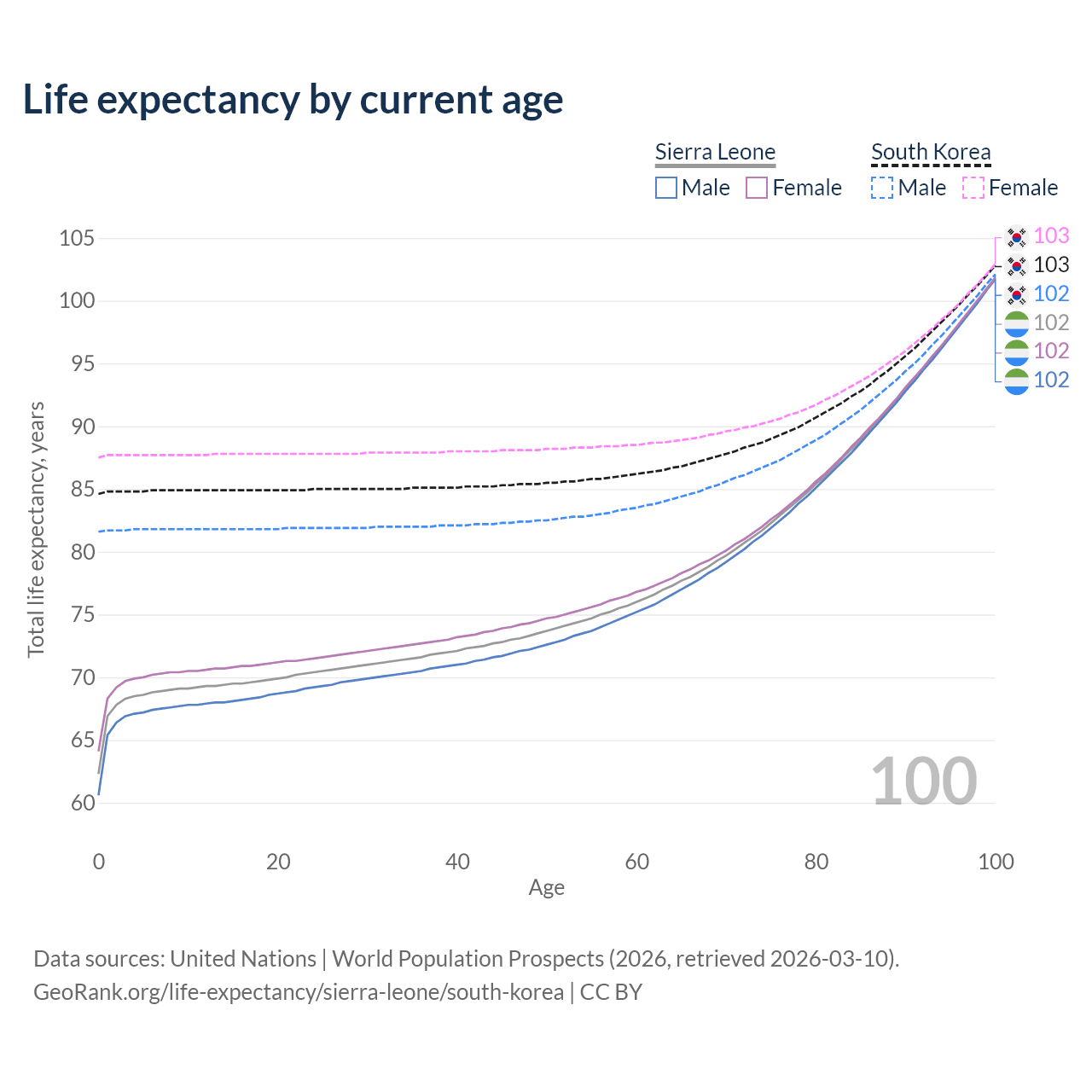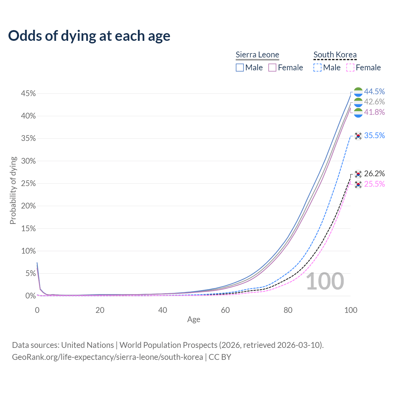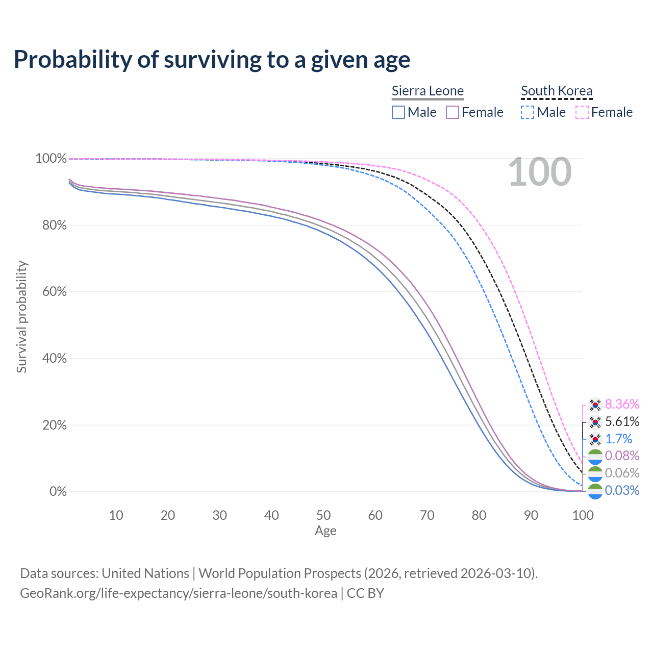 This life expectancy calculator shows the odds of living to 100, 95, 90, and below based on current age for both males and females in Sierra Leone and South Korea, along with mean and median age of death. The calculations are based on the 2026 life tables (actuarial tables) from the UN World Population Prospects.