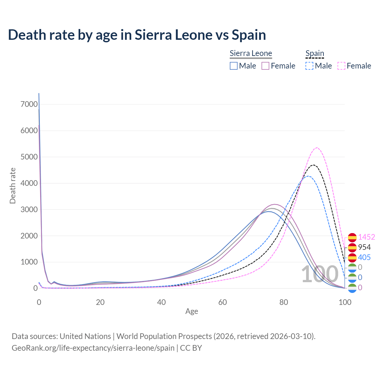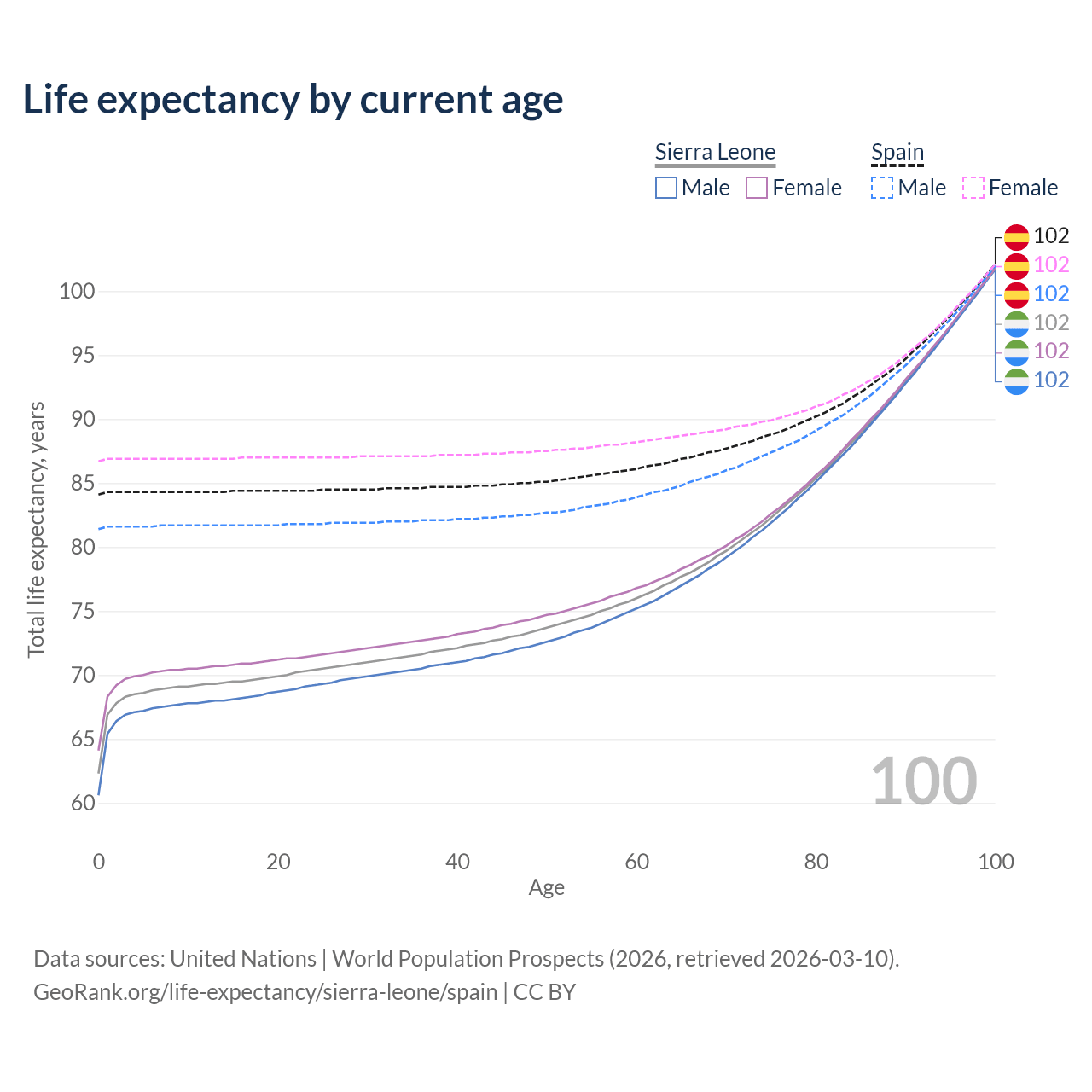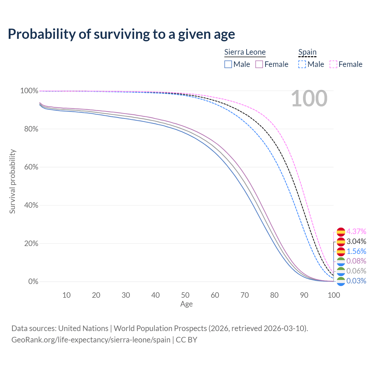 This life expectancy calculator shows the odds of living to 100, 95, 90, and below based on current age for both males and females in Sierra Leone and Spain, along with mean and median age of death. The calculations are based on the 2026 life tables (actuarial tables) from the UN World Population Prospects.