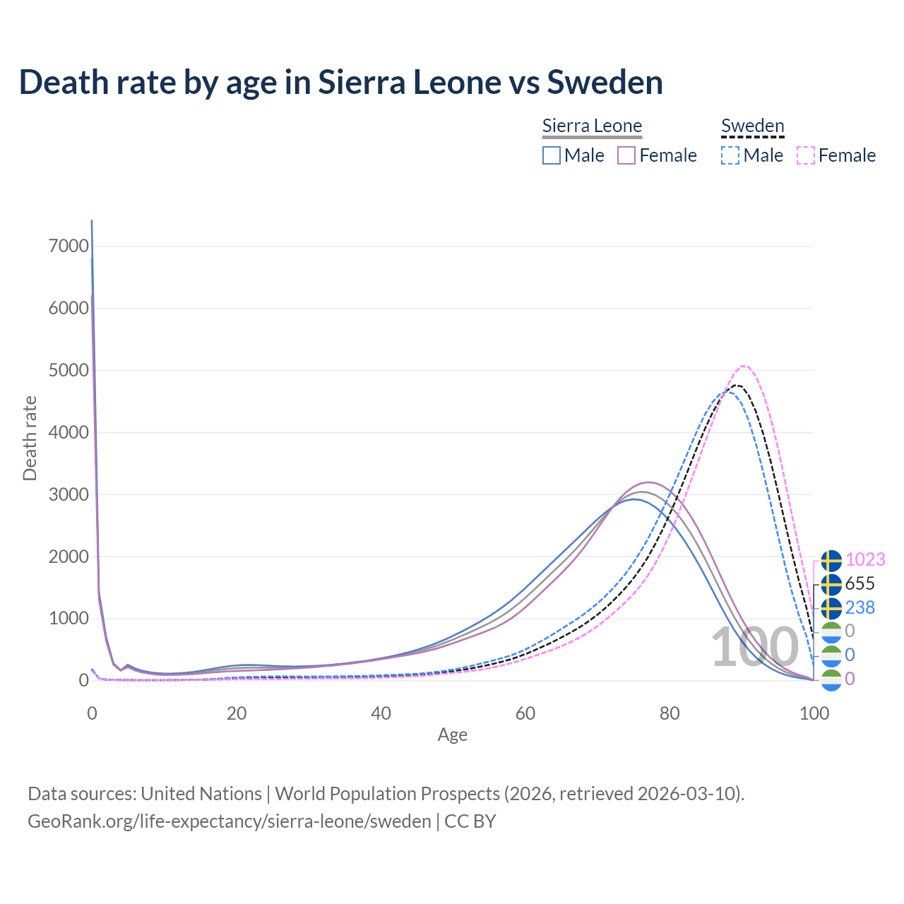 In Sierra Leone, the most common age of death is 0, compared to 89 in Sweden. The median age of death is 70.8 in Sierra Leone and 86.5 in Sweden, meaning only half of each cohort is expected to live past that age.