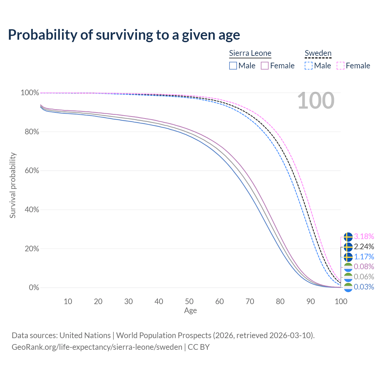 This life expectancy calculator shows the odds of living to 100, 95, 90, and below based on current age for both males and females in Sierra Leone and Sweden, along with mean and median age of death. The calculations are based on the 2026 life tables (actuarial tables) from the UN World Population Prospects.