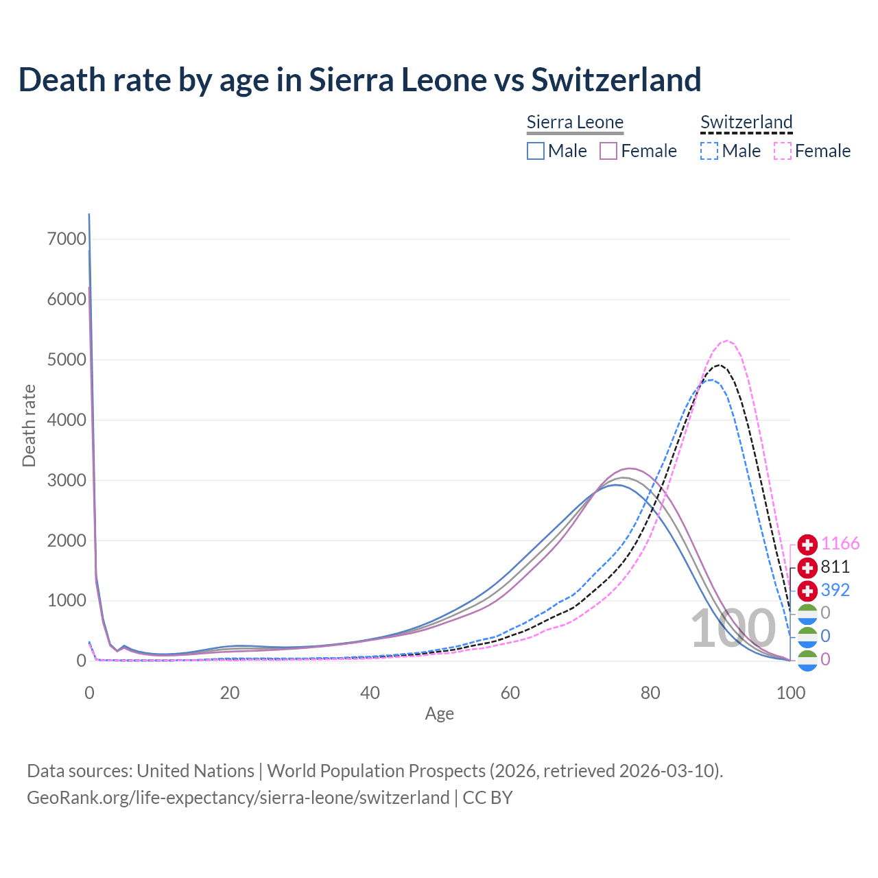 In Sierra Leone, the most common age of death is 0, compared to 90 in Switzerland. The median age of death is 70.8 in Sierra Leone and 87.2 in Switzerland, meaning only half of each cohort is expected to live past that age.