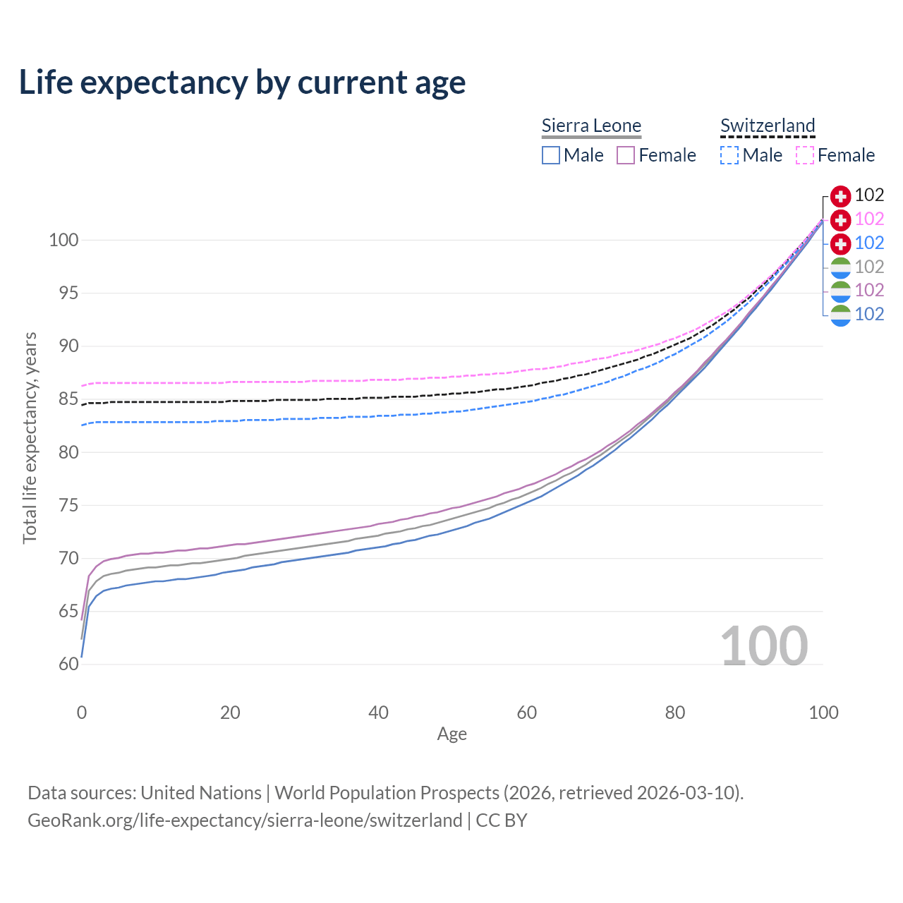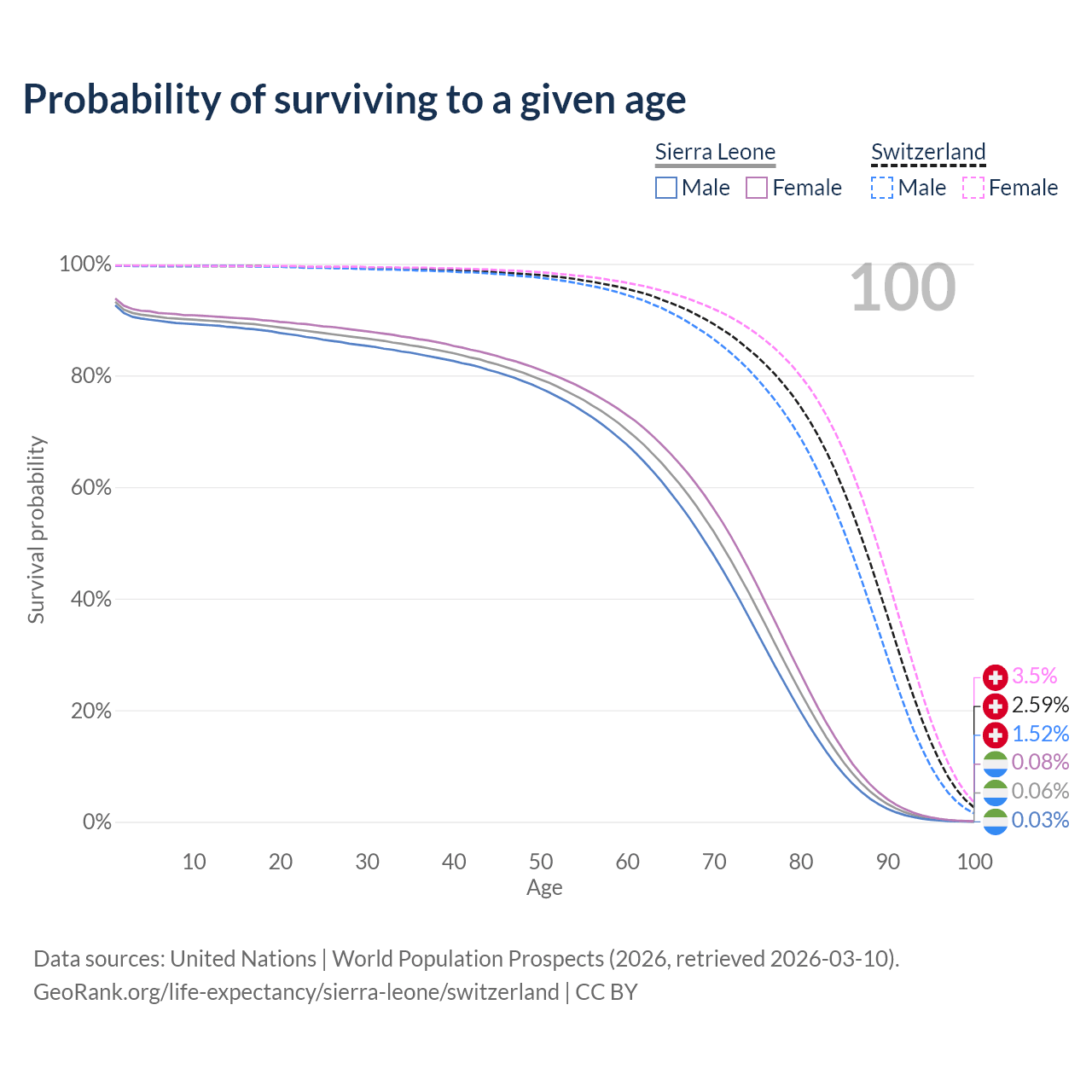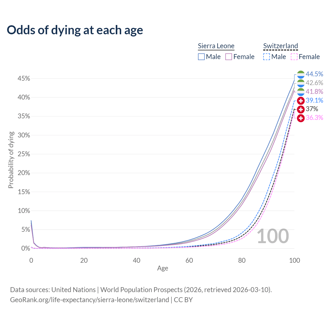 This life expectancy calculator shows the odds of living to 100, 95, 90, and below based on current age for both males and females in Sierra Leone and Switzerland, along with mean and median age of death. The calculations are based on the 2026 life tables (actuarial tables) from the UN World Population Prospects.