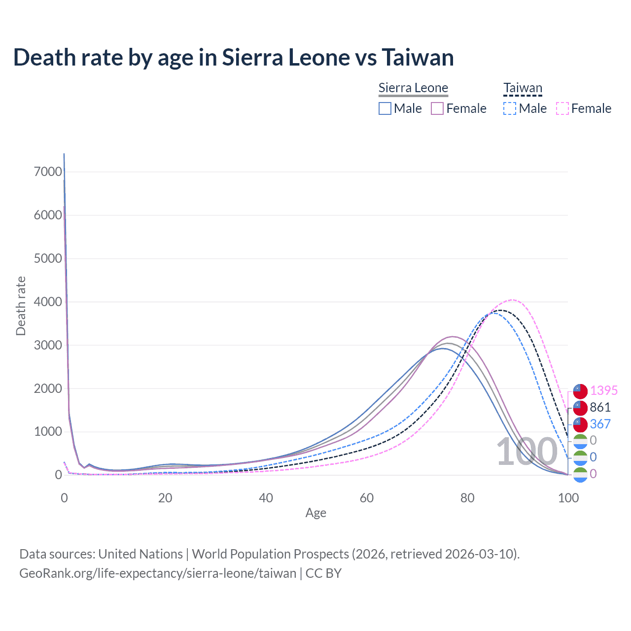 In Sierra Leone, the most common age of death is 0, compared to 87 in Taiwan. The median age of death is 70.8 in Sierra Leone and 84.3 in Taiwan, meaning only half of each cohort is expected to live past that age.