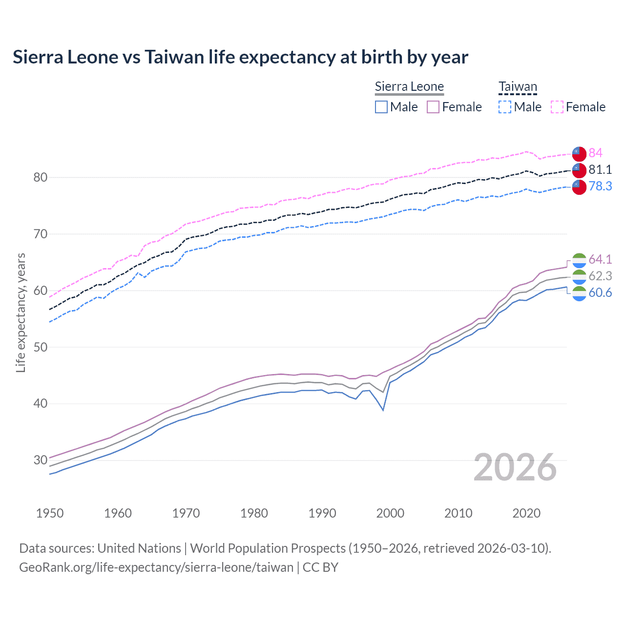The average life expectancy at birth is 62.3 years in Sierra Leone vs 81.1 in Taiwan. Sierra Leone is ranked 186/197 by life expectancy, and Taiwan is 40/197. In Sierra Leone, the life expectancy is 60.6 years for males and 64.1 years for females. In Taiwan, it's 78.3 years for males and 84 years for females.