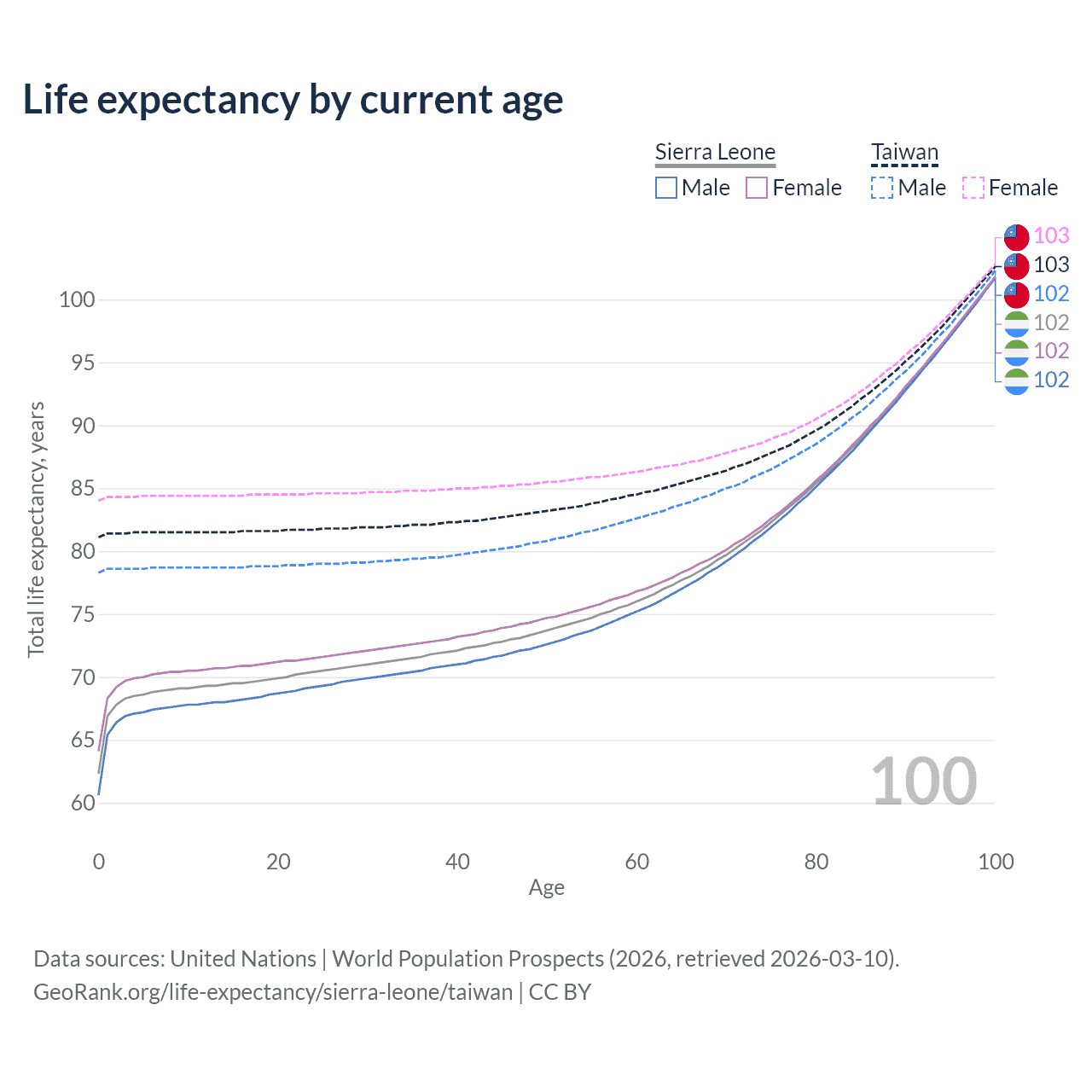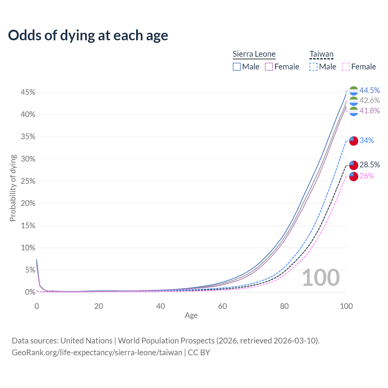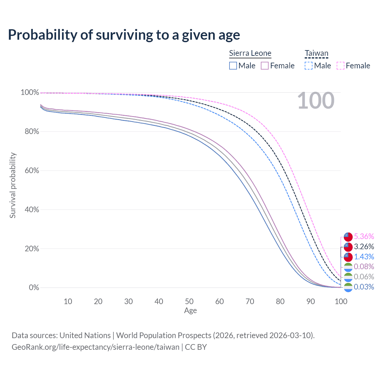 This life expectancy calculator shows the odds of living to 100, 95, 90, and below based on current age for both males and females in Sierra Leone and Taiwan, along with mean and median age of death. The calculations are based on the 2026 life tables (actuarial tables) from the UN World Population Prospects.