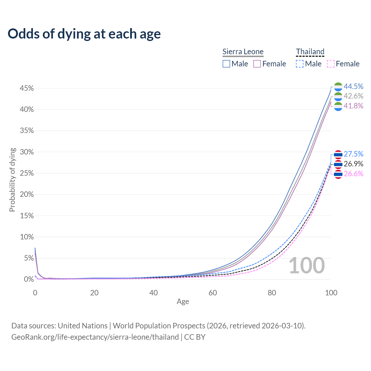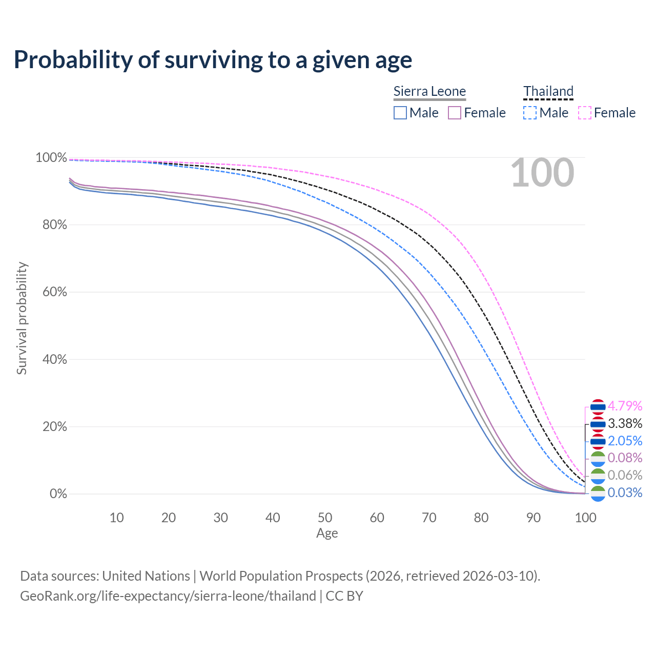 This life expectancy calculator shows the odds of living to 100, 95, 90, and below based on current age for both males and females in Sierra Leone and Thailand, along with mean and median age of death. The calculations are based on the 2026 life tables (actuarial tables) from the UN World Population Prospects.