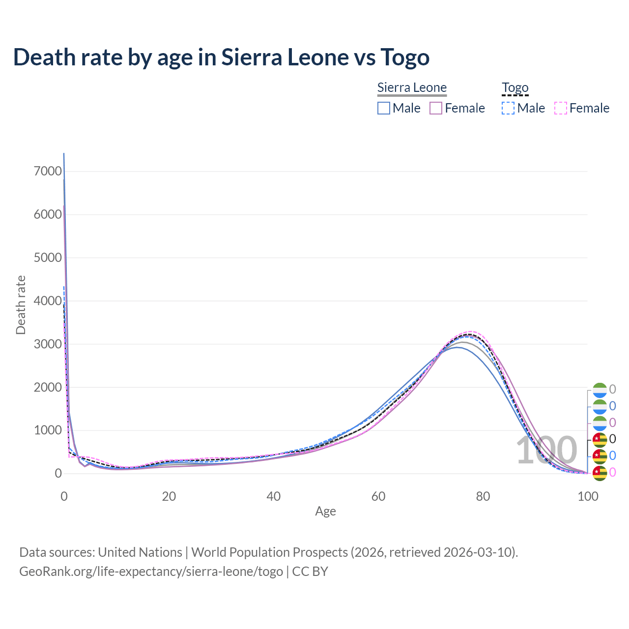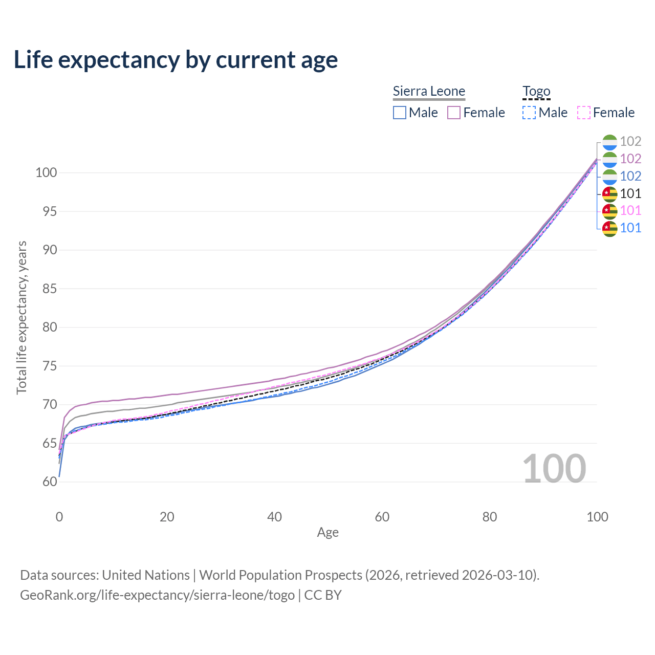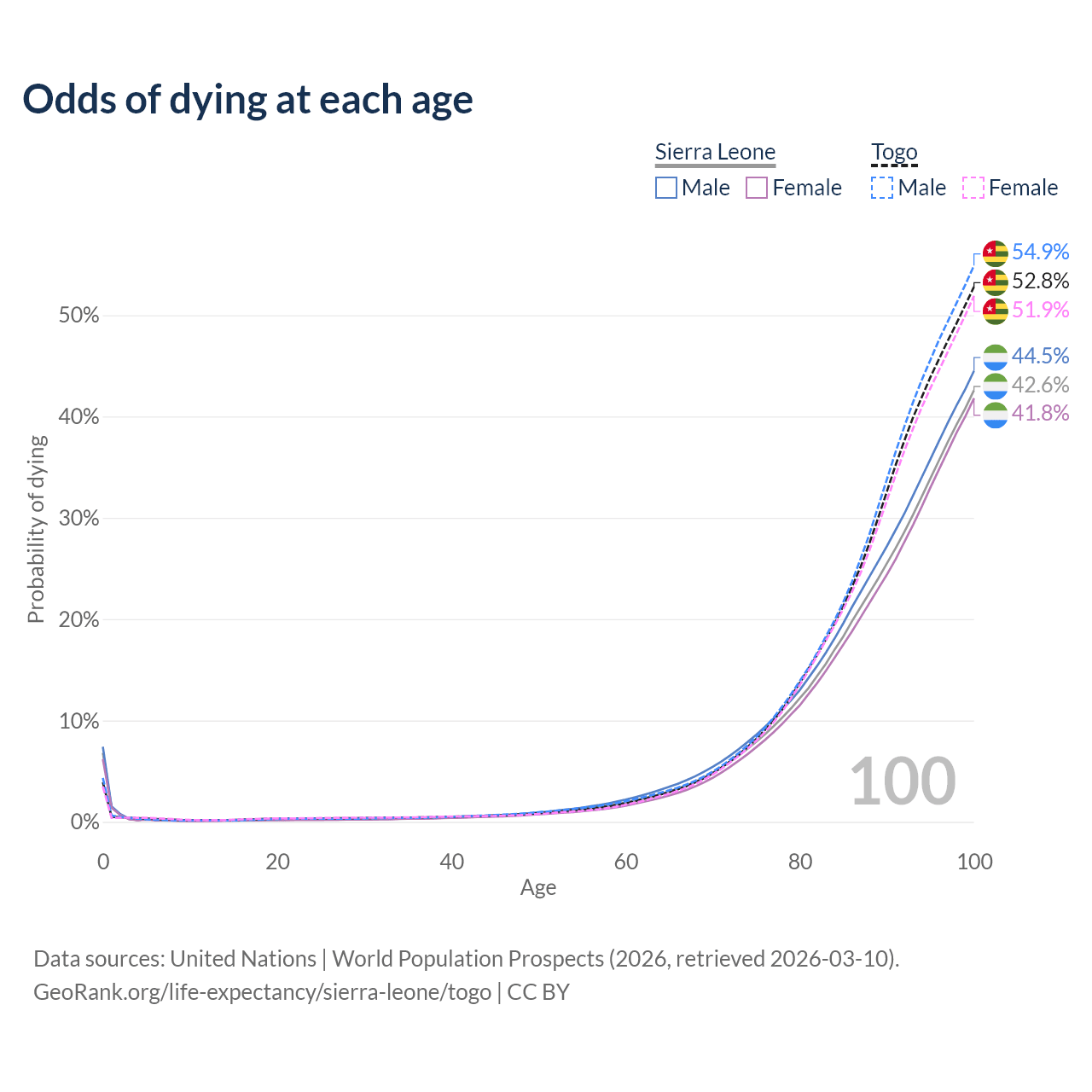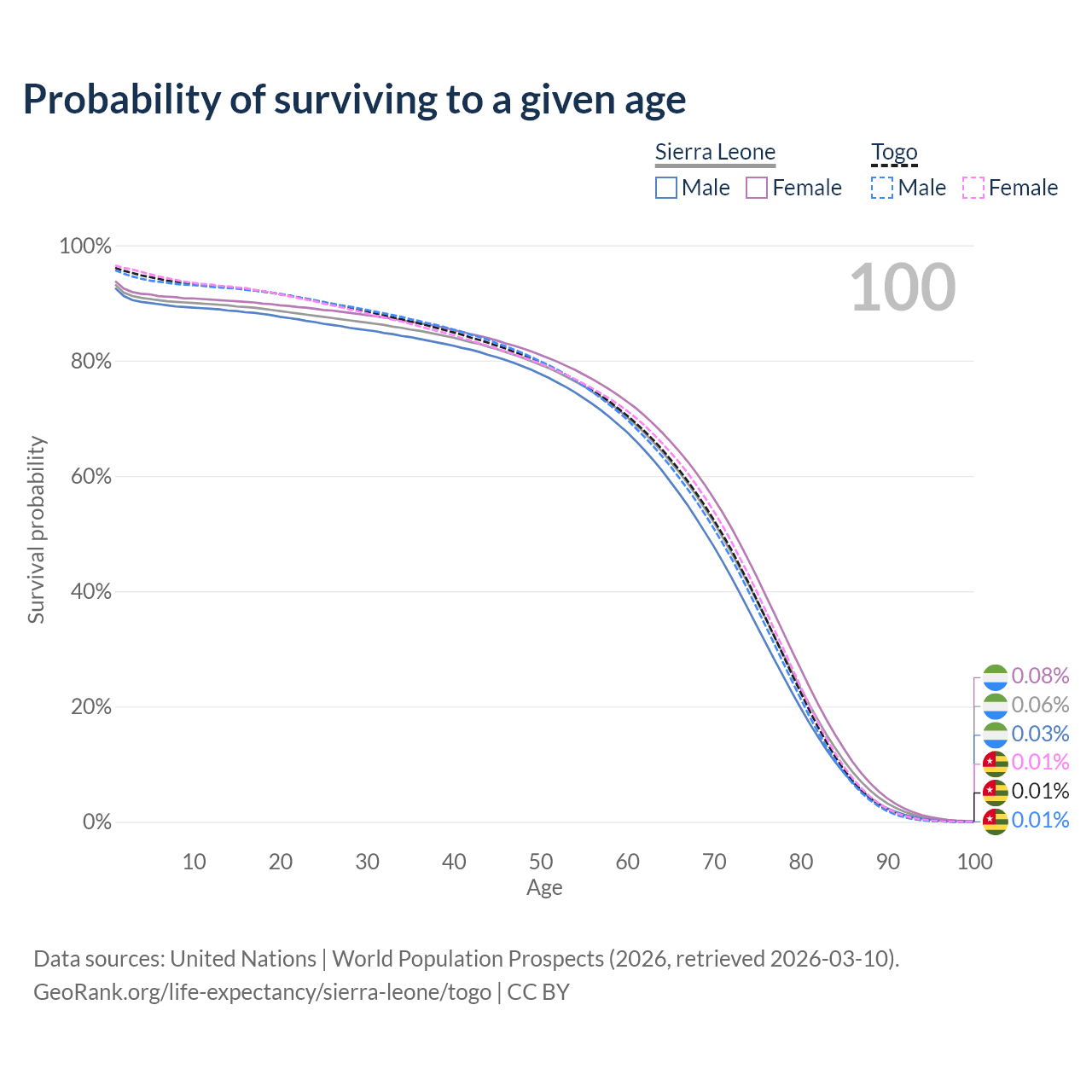 This life expectancy calculator shows the odds of living to 100, 95, 90, and below based on current age for both males and females in Sierra Leone and Togo, along with mean and median age of death. The calculations are based on the 2026 life tables (actuarial tables) from the UN World Population Prospects.