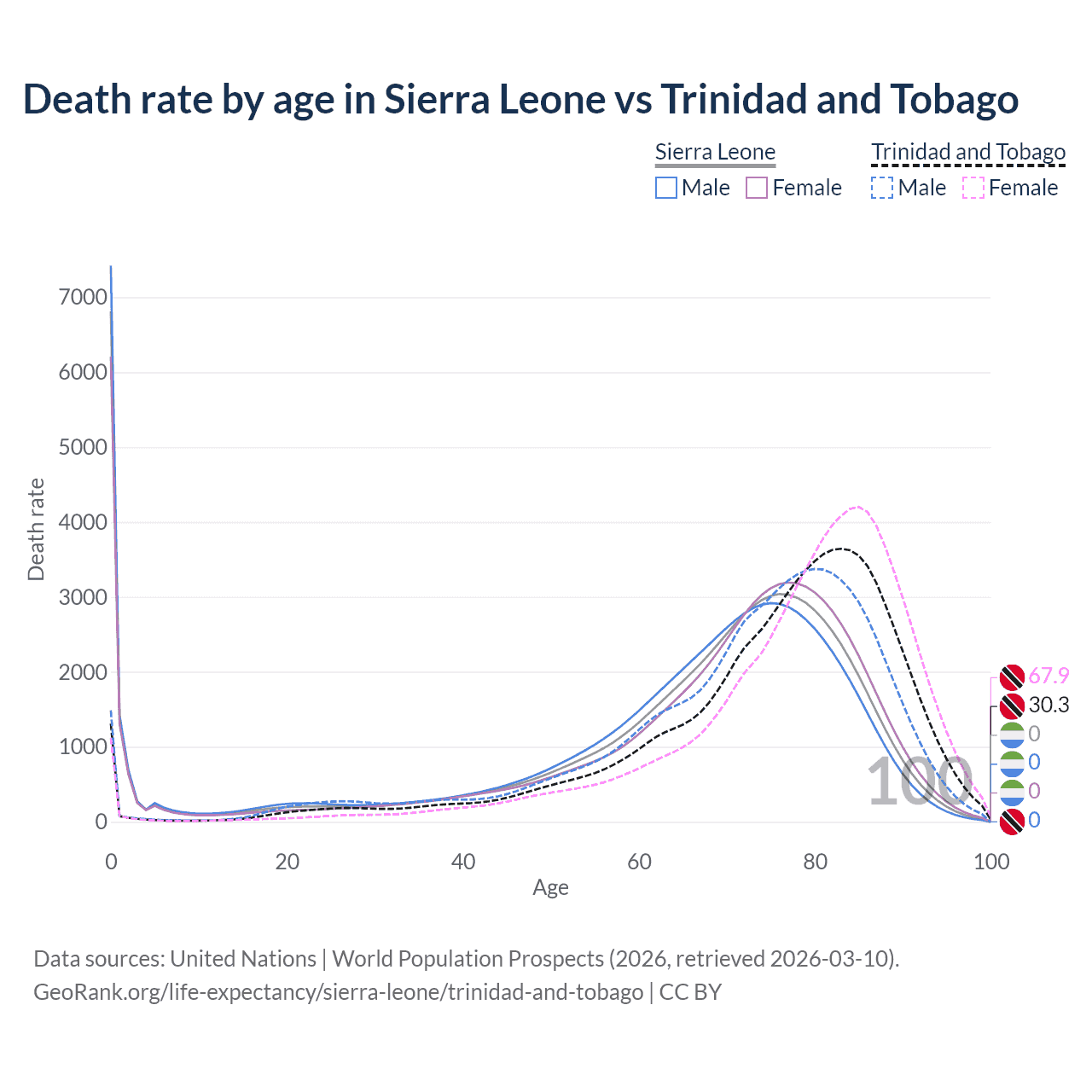 In Sierra Leone, the most common age of death is 0, compared to 83 in Trinidad and Tobago. The median age of death is 70.8 in Sierra Leone and 78.4 in Trinidad and Tobago, meaning only half of each cohort is expected to live past that age.