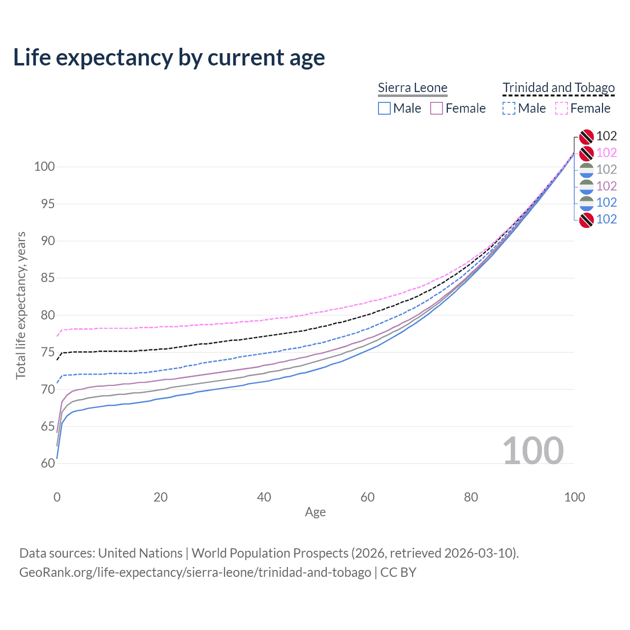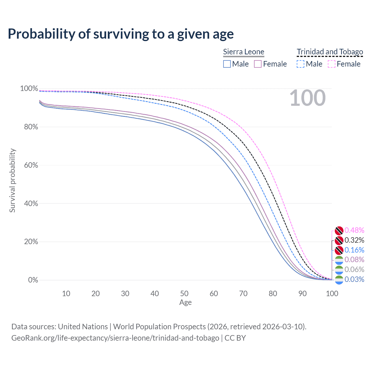 This life expectancy calculator shows the odds of living to 100, 95, 90, and below based on current age for both males and females in Sierra Leone and Trinidad and Tobago, along with mean and median age of death. The calculations are based on the 2026 life tables (actuarial tables) from the UN World Population Prospects.