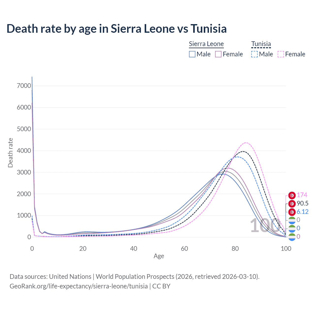 In Sierra Leone, the most common age of death is 0, compared to 83 in Tunisia. The median age of death is 70.8 in Sierra Leone and 80.2 in Tunisia, meaning only half of each cohort is expected to live past that age.
