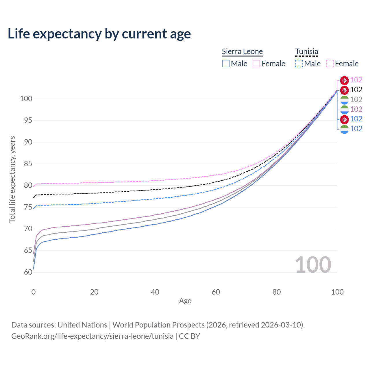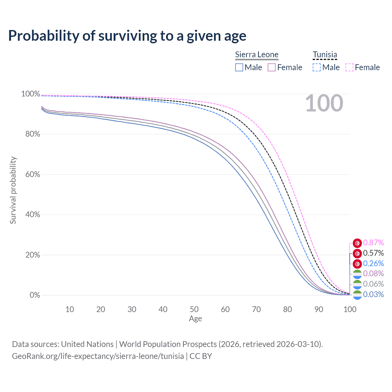 This life expectancy calculator shows the odds of living to 100, 95, 90, and below based on current age for both males and females in Sierra Leone and Tunisia, along with mean and median age of death. The calculations are based on the 2026 life tables (actuarial tables) from the UN World Population Prospects.
