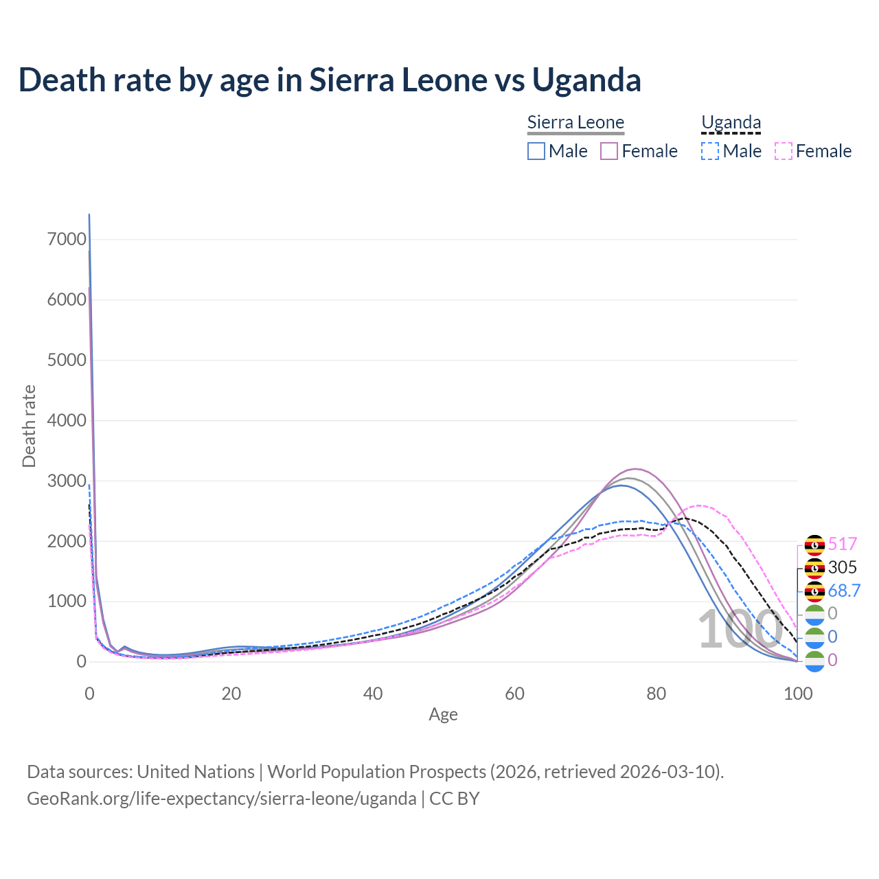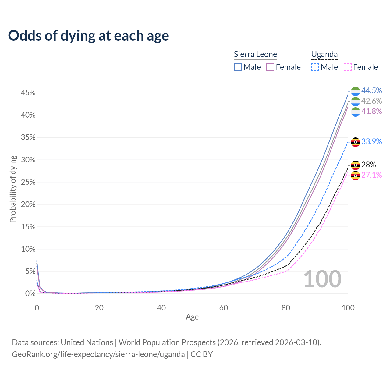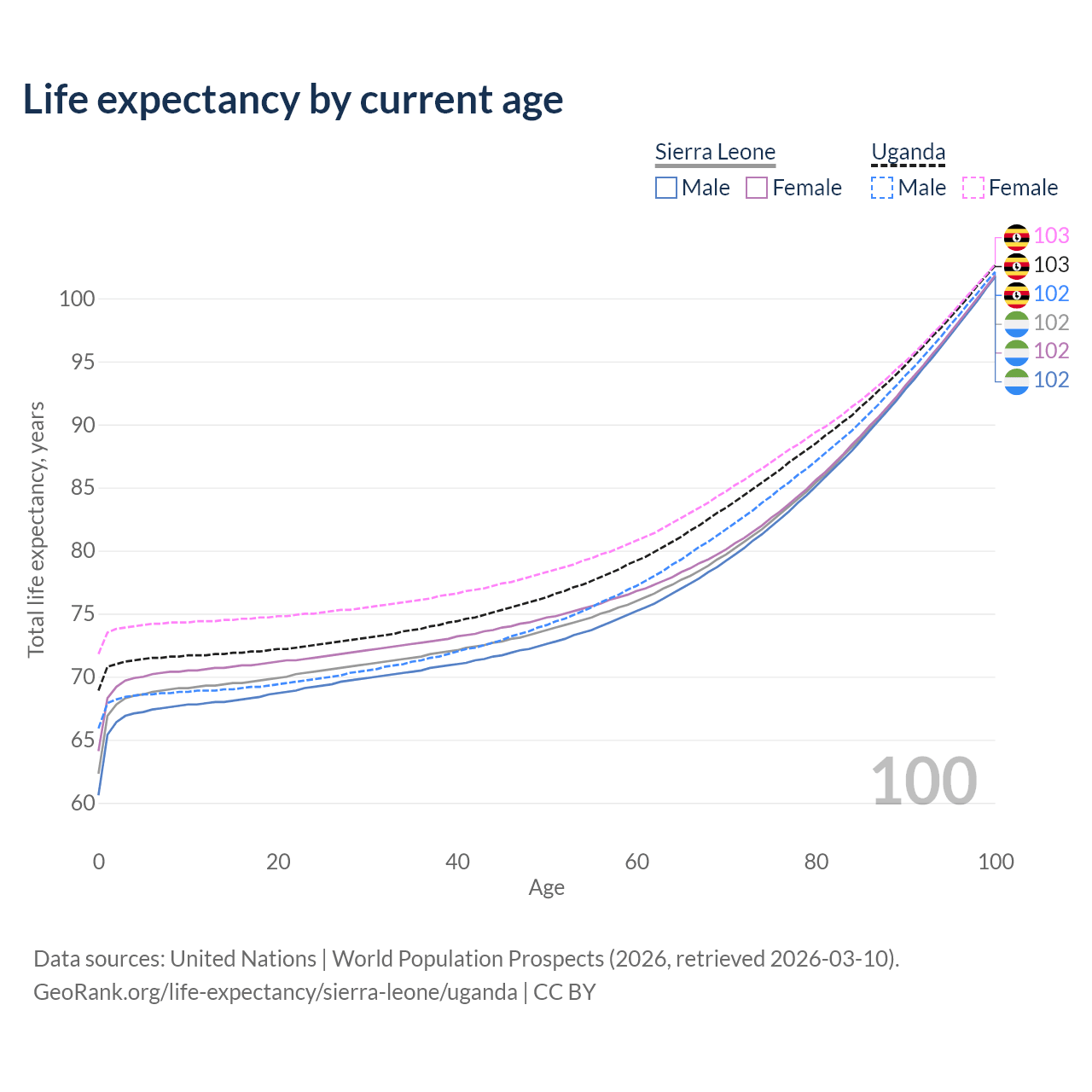 This life expectancy calculator shows the odds of living to 100, 95, 90, and below based on current age for both males and females in Sierra Leone and Uganda, along with mean and median age of death. The calculations are based on the 2026 life tables (actuarial tables) from the UN World Population Prospects.