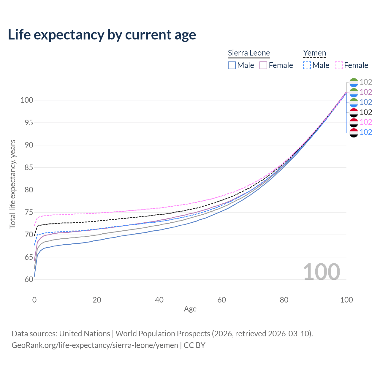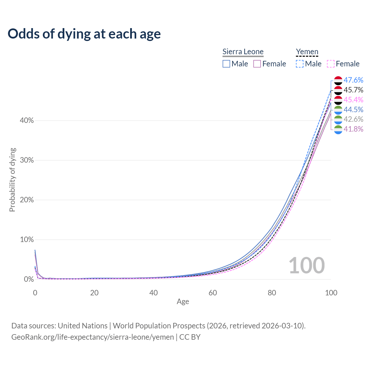 This life expectancy calculator shows the odds of living to 100, 95, 90, and below based on current age for both males and females in Sierra Leone and Yemen, along with mean and median age of death. The calculations are based on the 2026 life tables (actuarial tables) from the UN World Population Prospects.