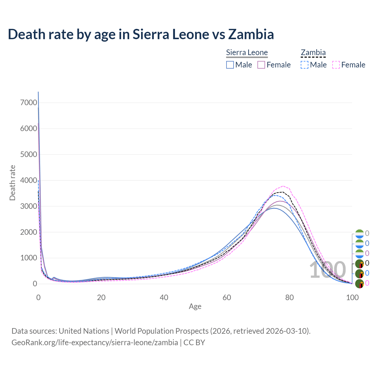 In Sierra Leone, the most common age of death is 0, compared to 0 in Zambia. The median age of death is 70.8 in Sierra Leone and 73.1 in Zambia, meaning only half of each cohort is expected to live past that age.