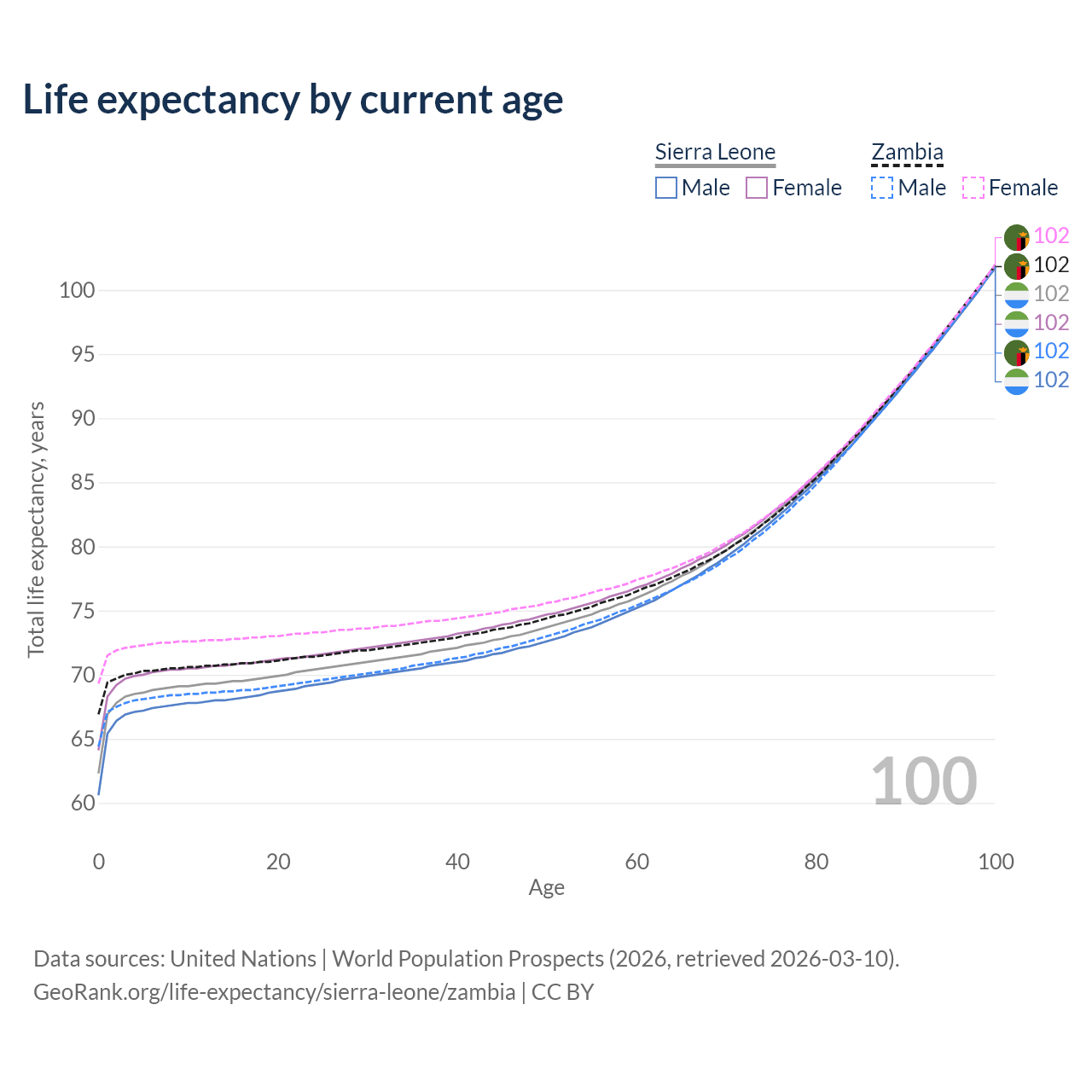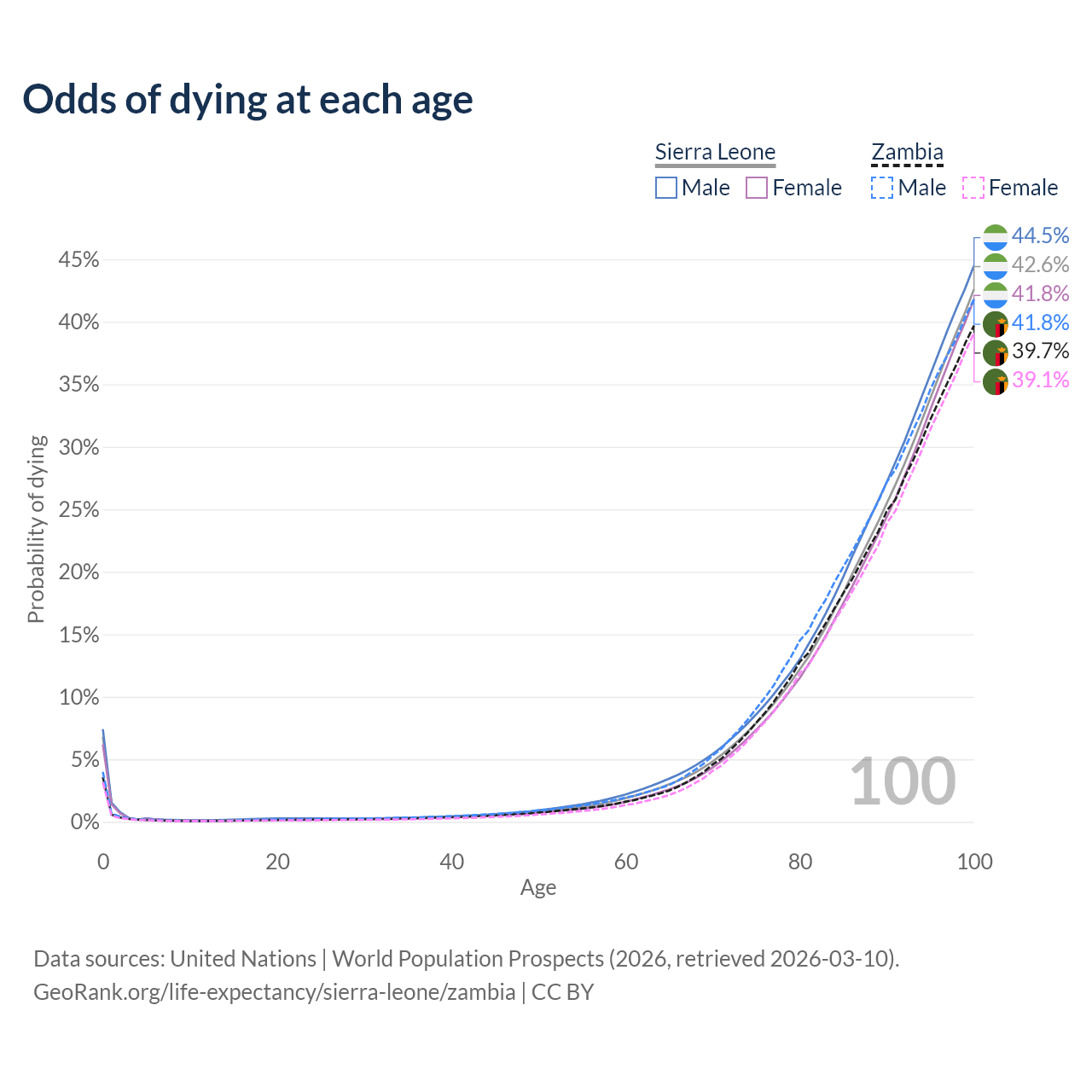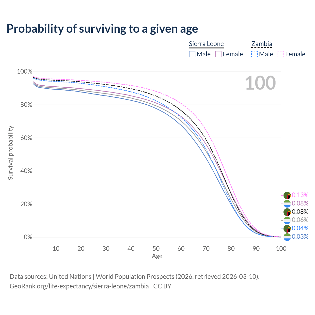 This life expectancy calculator shows the odds of living to 100, 95, 90, and below based on current age for both males and females in Sierra Leone and Zambia, along with mean and median age of death. The calculations are based on the 2026 life tables (actuarial tables) from the UN World Population Prospects.