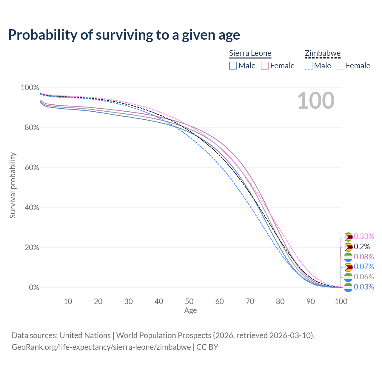 This life expectancy calculator shows the odds of living to 100, 95, 90, and below based on current age for both males and females in Sierra Leone and Zimbabwe, along with mean and median age of death. The calculations are based on the 2026 life tables (actuarial tables) from the UN World Population Prospects.