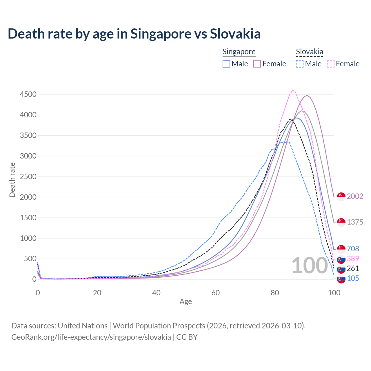 This life expectancy calculator shows the odds of living to 100, 95, 90, and below based on current age for both males and females in Singapore and Slovakia, along with mean and median age of death. The calculations are based on the 2026 life tables (actuarial tables) from the UN World Population Prospects.