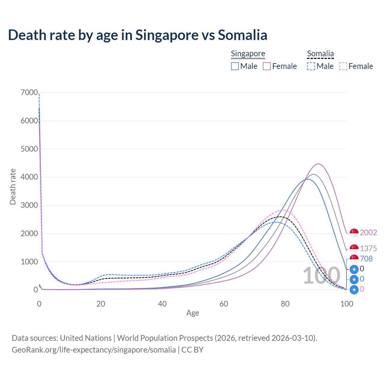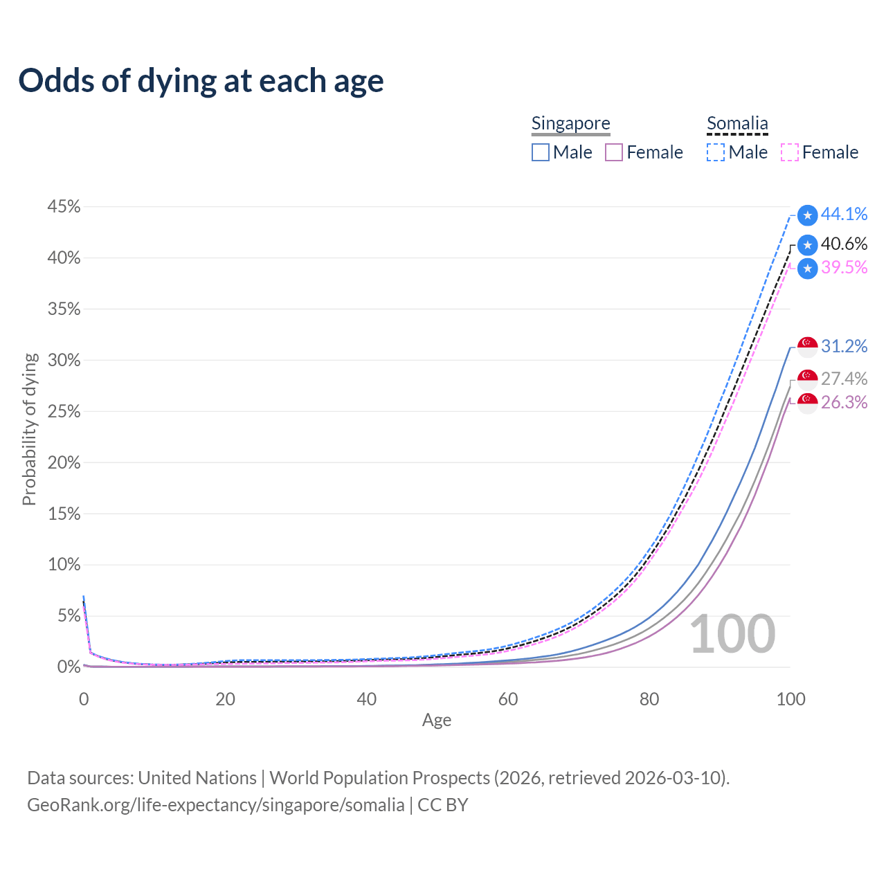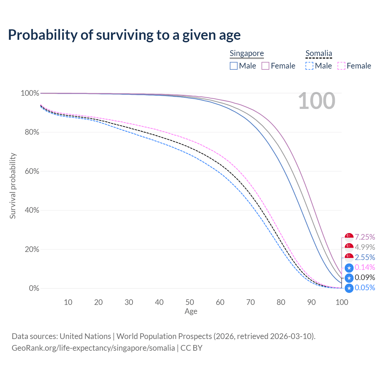 This life expectancy calculator shows the odds of living to 100, 95, 90, and below based on current age for both males and females in Singapore and Somalia, along with mean and median age of death. The calculations are based on the 2026 life tables (actuarial tables) from the UN World Population Prospects.