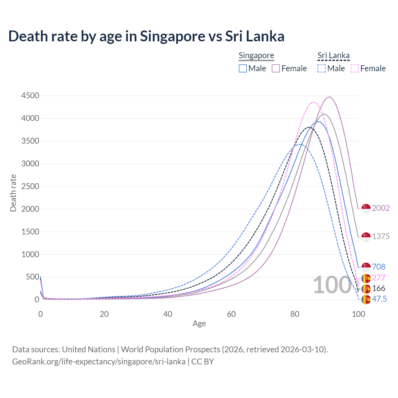 In Singapore, the most common age of death is 89, compared to 85 in Sri Lanka. The median age of death is 86.5 in Singapore and 81 in Sri Lanka, meaning only half of each cohort is expected to live past that age.