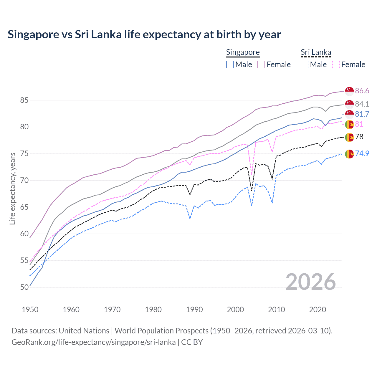 The average life expectancy at birth is 84.1 years in Singapore vs 78 in Sri Lanka. Singapore is ranked 9/197 by life expectancy, and Sri Lanka is 64/197. In Singapore, the life expectancy is 81.7 years for males and 86.6 years for females. In Sri Lanka, it's 74.9 years for males and 81 years for females.