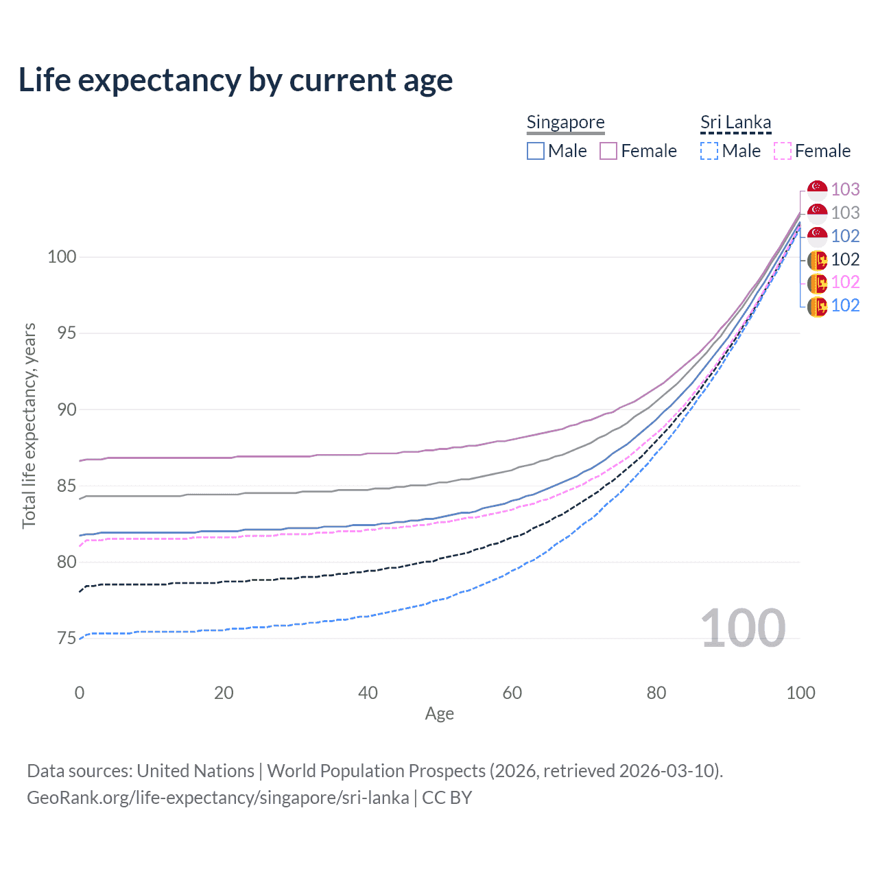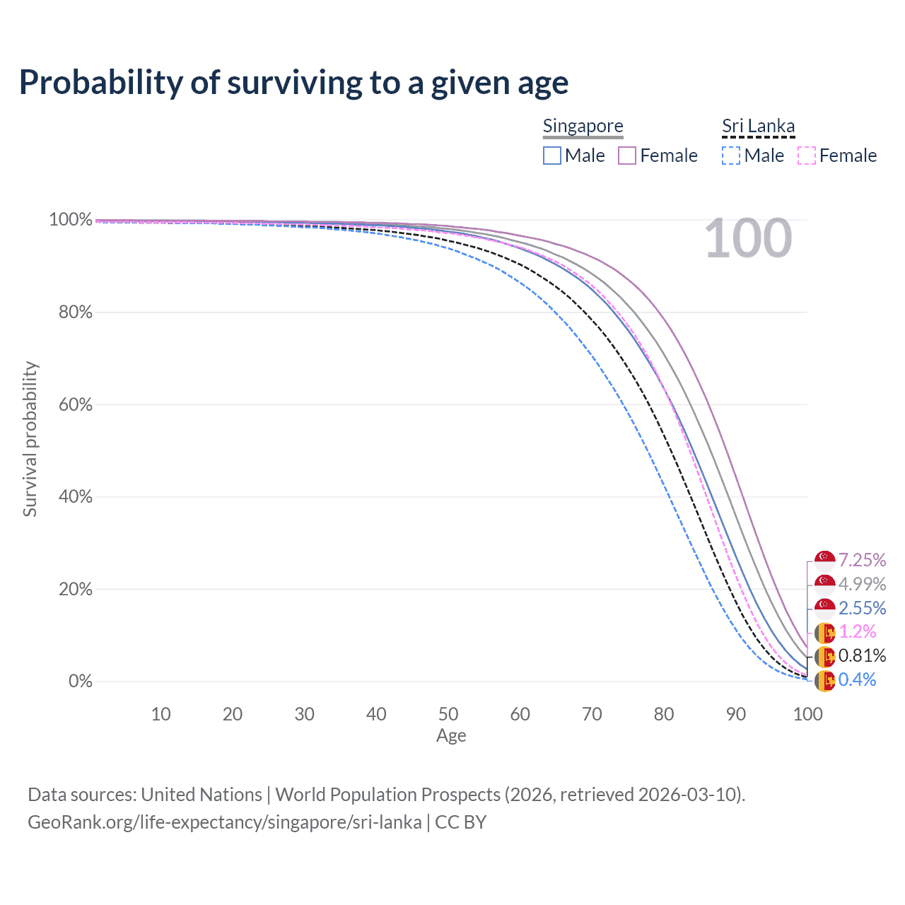 This life expectancy calculator shows the odds of living to 100, 95, 90, and below based on current age for both males and females in Singapore and Sri Lanka, along with mean and median age of death. The calculations are based on the 2026 life tables (actuarial tables) from the UN World Population Prospects.