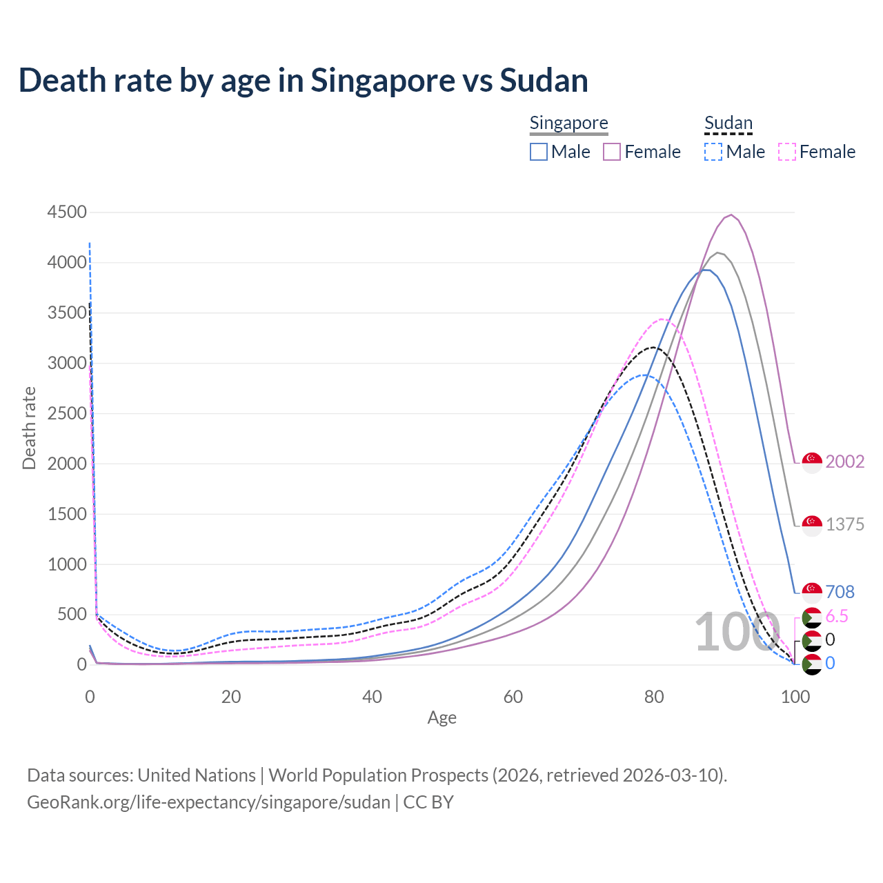 In Singapore, the most common age of death is 89, compared to 0 in Sudan. The median age of death is 86.5 in Singapore and 74.1 in Sudan, meaning only half of each cohort is expected to live past that age.