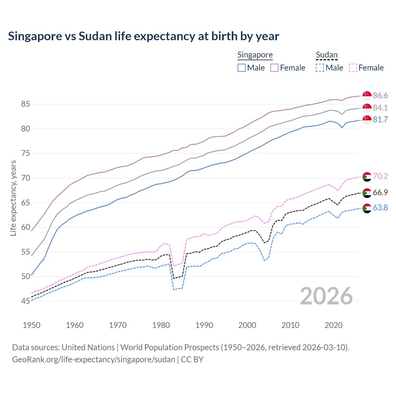 The average life expectancy at birth is 84.1 years in Singapore vs 66.9 in Sudan. Singapore is ranked 9/197 by life expectancy, and Sudan is 160/197. In Singapore, the life expectancy is 81.7 years for males and 86.6 years for females. In Sudan, it's 63.8 years for males and 70.2 years for females.