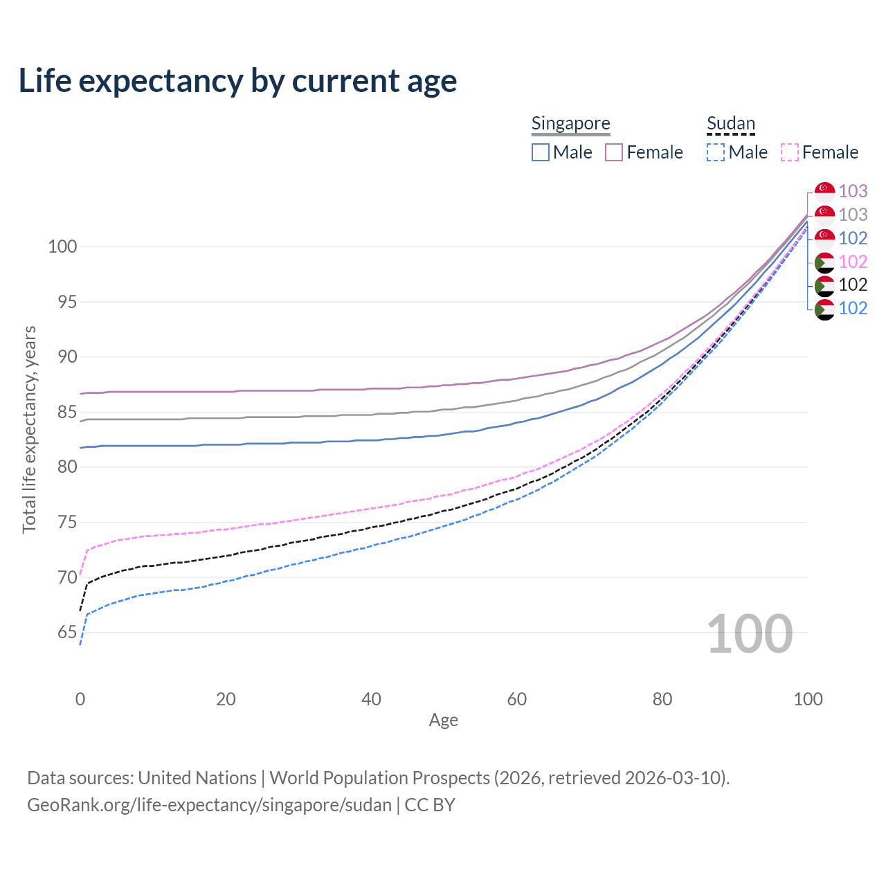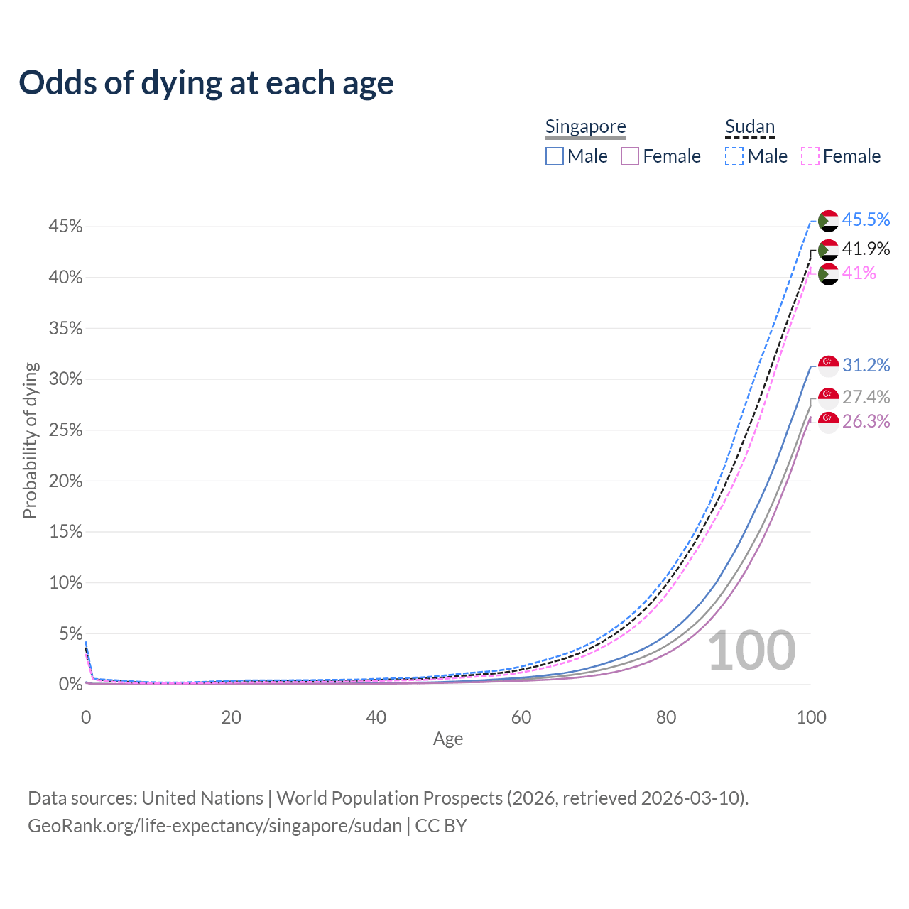 This life expectancy calculator shows the odds of living to 100, 95, 90, and below based on current age for both males and females in Singapore and Sudan, along with mean and median age of death. The calculations are based on the 2026 life tables (actuarial tables) from the UN World Population Prospects.