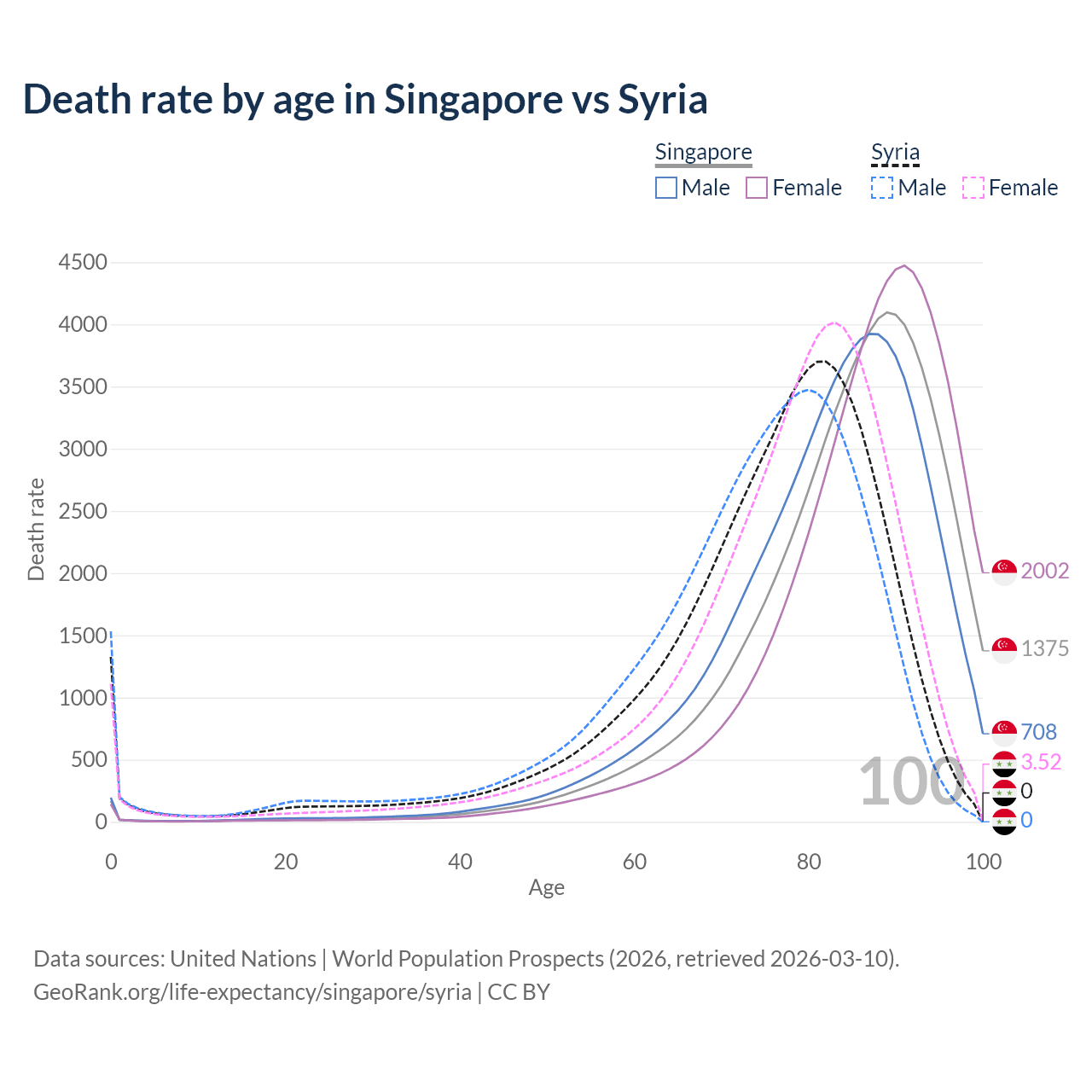 In Singapore, the most common age of death is 89, compared to 82 in Syria. The median age of death is 86.5 in Singapore and 77.7 in Syria, meaning only half of each cohort is expected to live past that age.