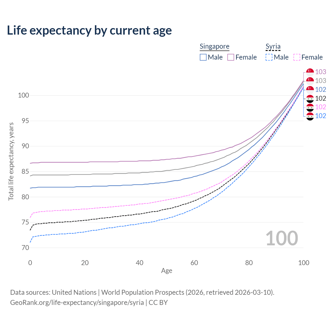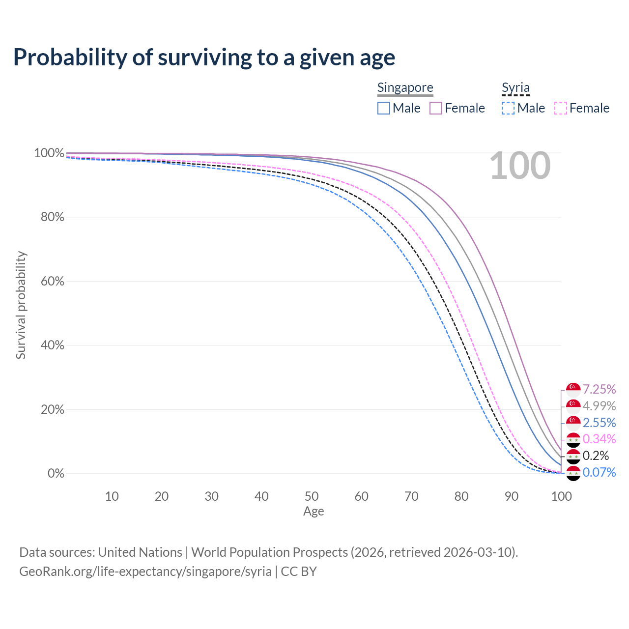 This life expectancy calculator shows the odds of living to 100, 95, 90, and below based on current age for both males and females in Singapore and Syria, along with mean and median age of death. The calculations are based on the 2026 life tables (actuarial tables) from the UN World Population Prospects.