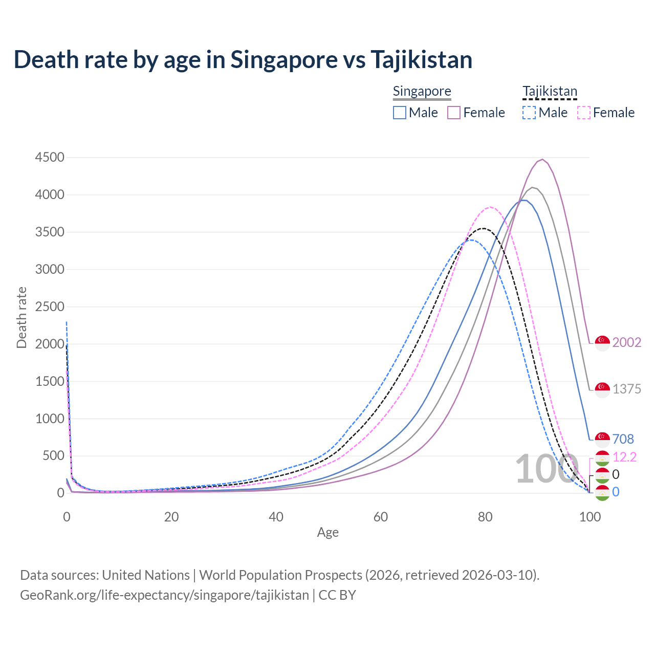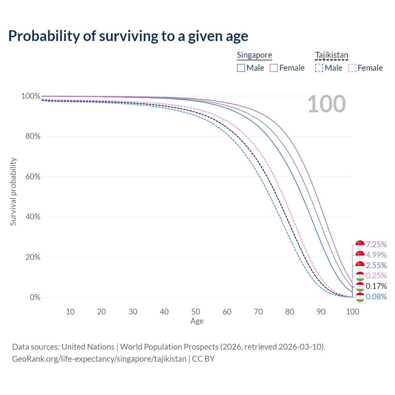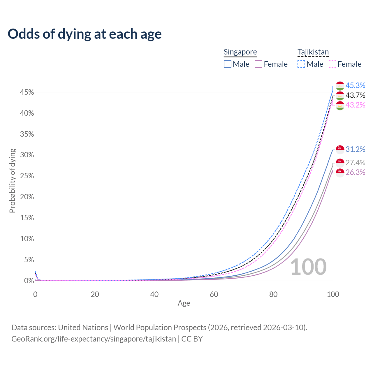 This life expectancy calculator shows the odds of living to 100, 95, 90, and below based on current age for both males and females in Singapore and Tajikistan, along with mean and median age of death. The calculations are based on the 2026 life tables (actuarial tables) from the UN World Population Prospects.