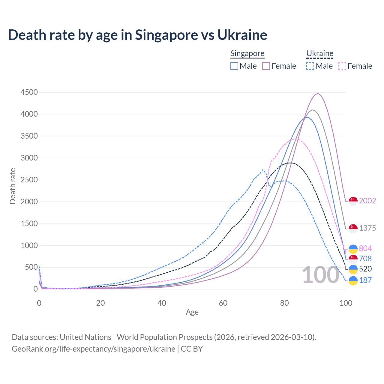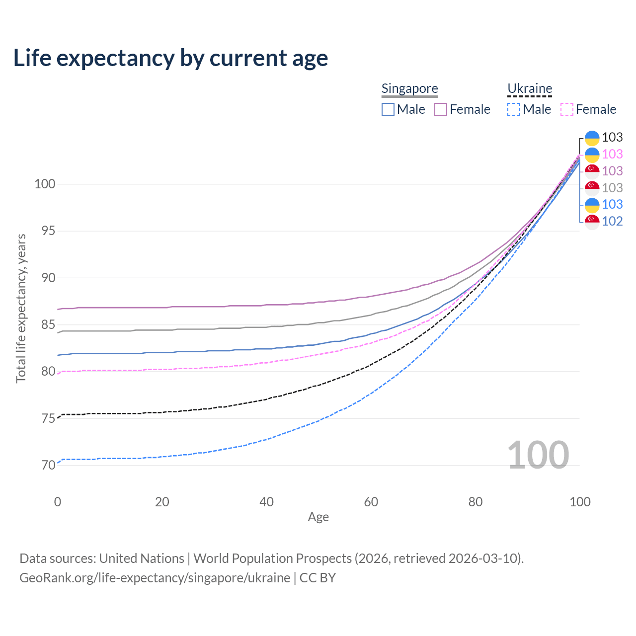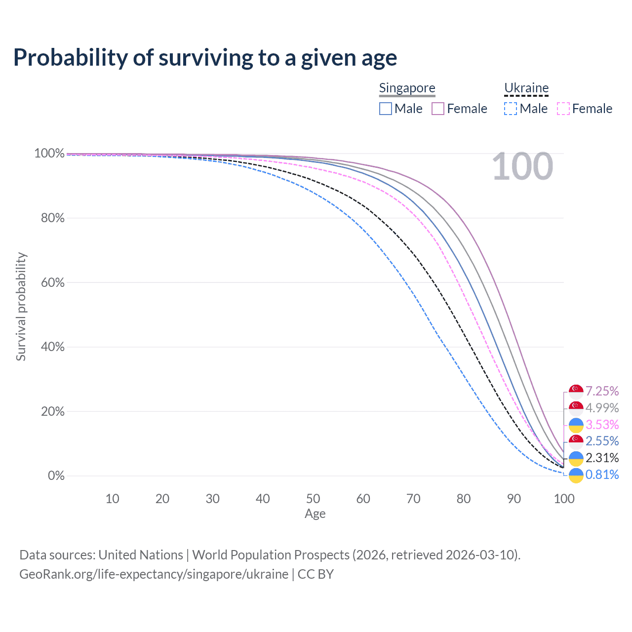 This life expectancy calculator shows the odds of living to 100, 95, 90, and below based on current age for both males and females in Singapore and Ukraine, along with mean and median age of death. The calculations are based on the 2026 life tables (actuarial tables) from the UN World Population Prospects.