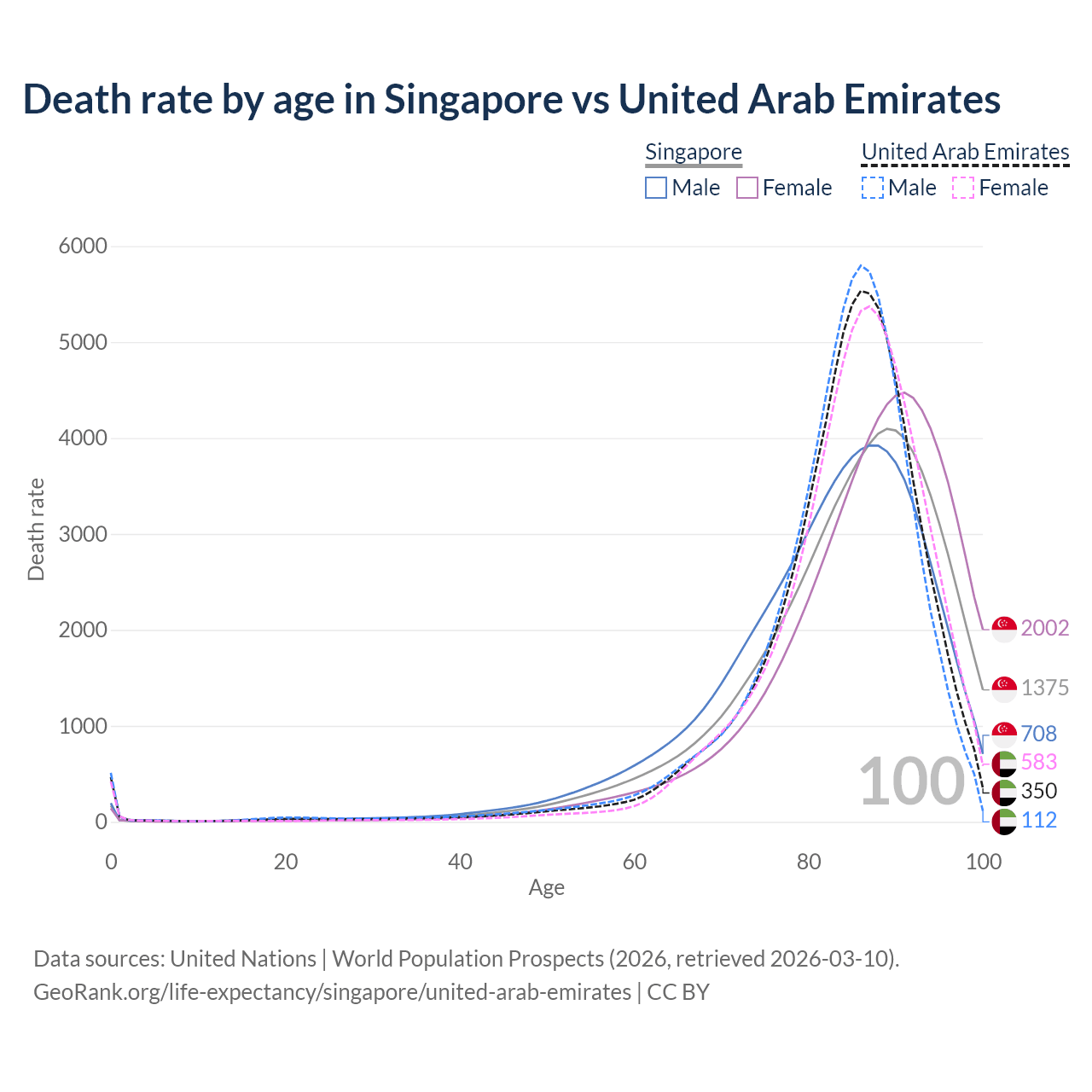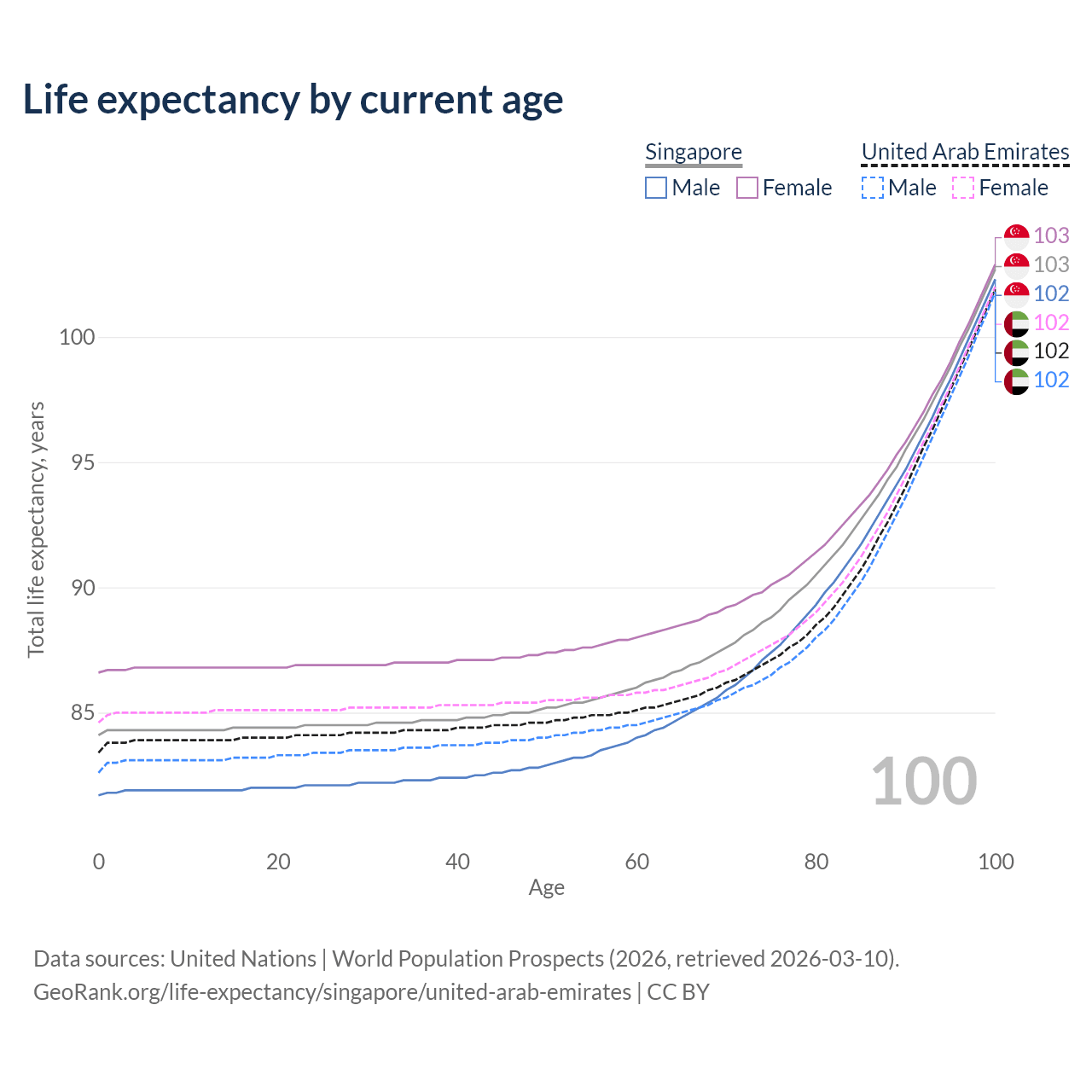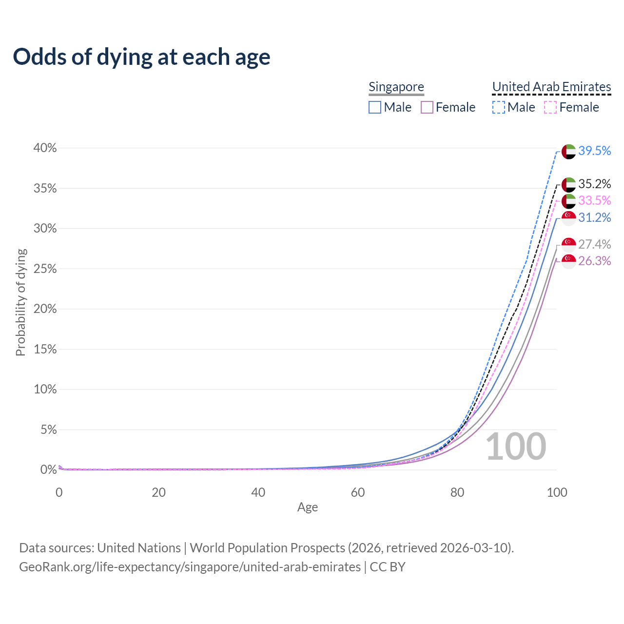 This life expectancy calculator shows the odds of living to 100, 95, 90, and below based on current age for both males and females in Singapore and the United Arab Emirates, along with mean and median age of death. The calculations are based on the 2026 life tables (actuarial tables) from the UN World Population Prospects.