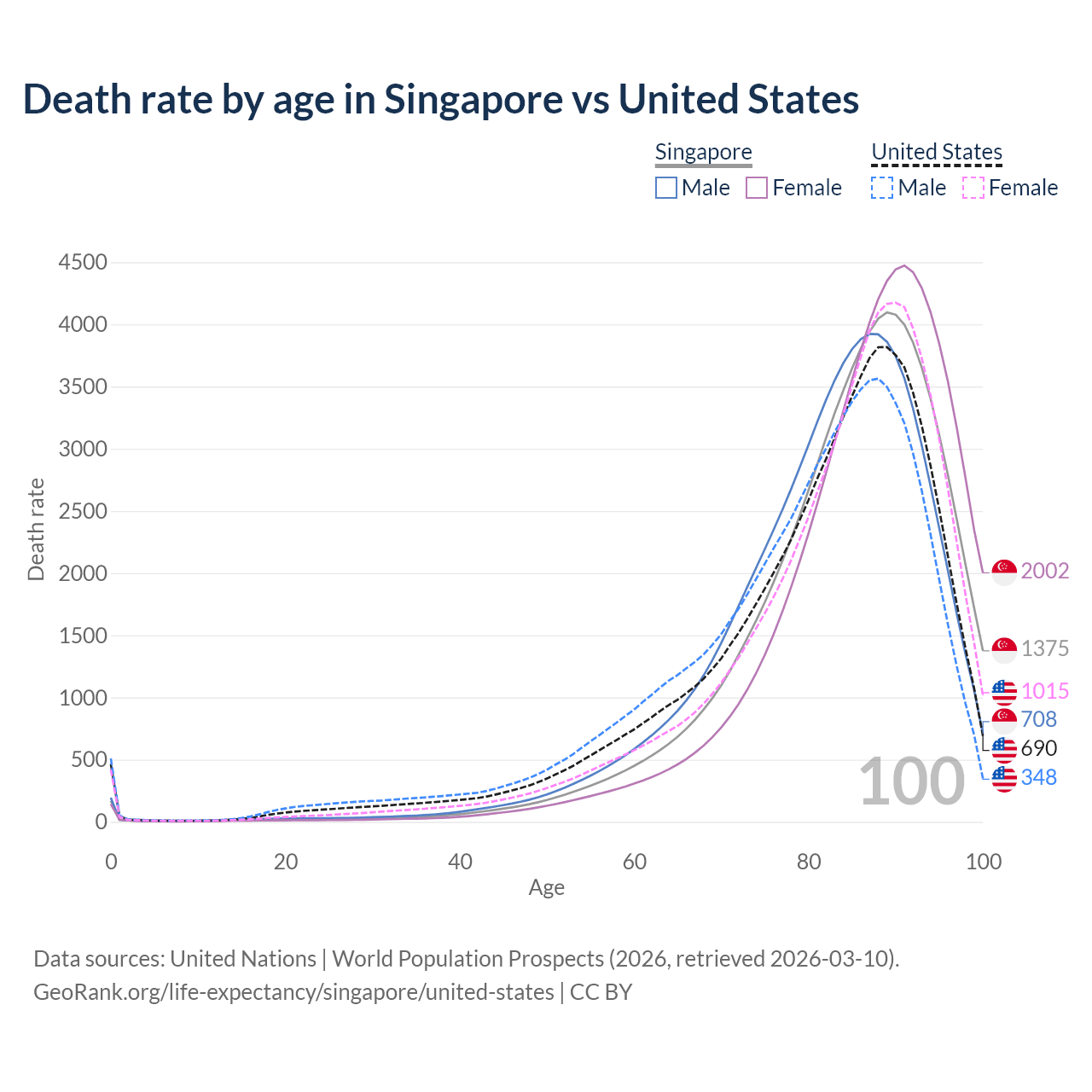 This life expectancy calculator shows the odds of living to 100, 95, 90, and below based on current age for both males and females in Singapore and the United States, along with mean and median age of death. The calculations are based on the 2026 life tables (actuarial tables) from the UN World Population Prospects.
