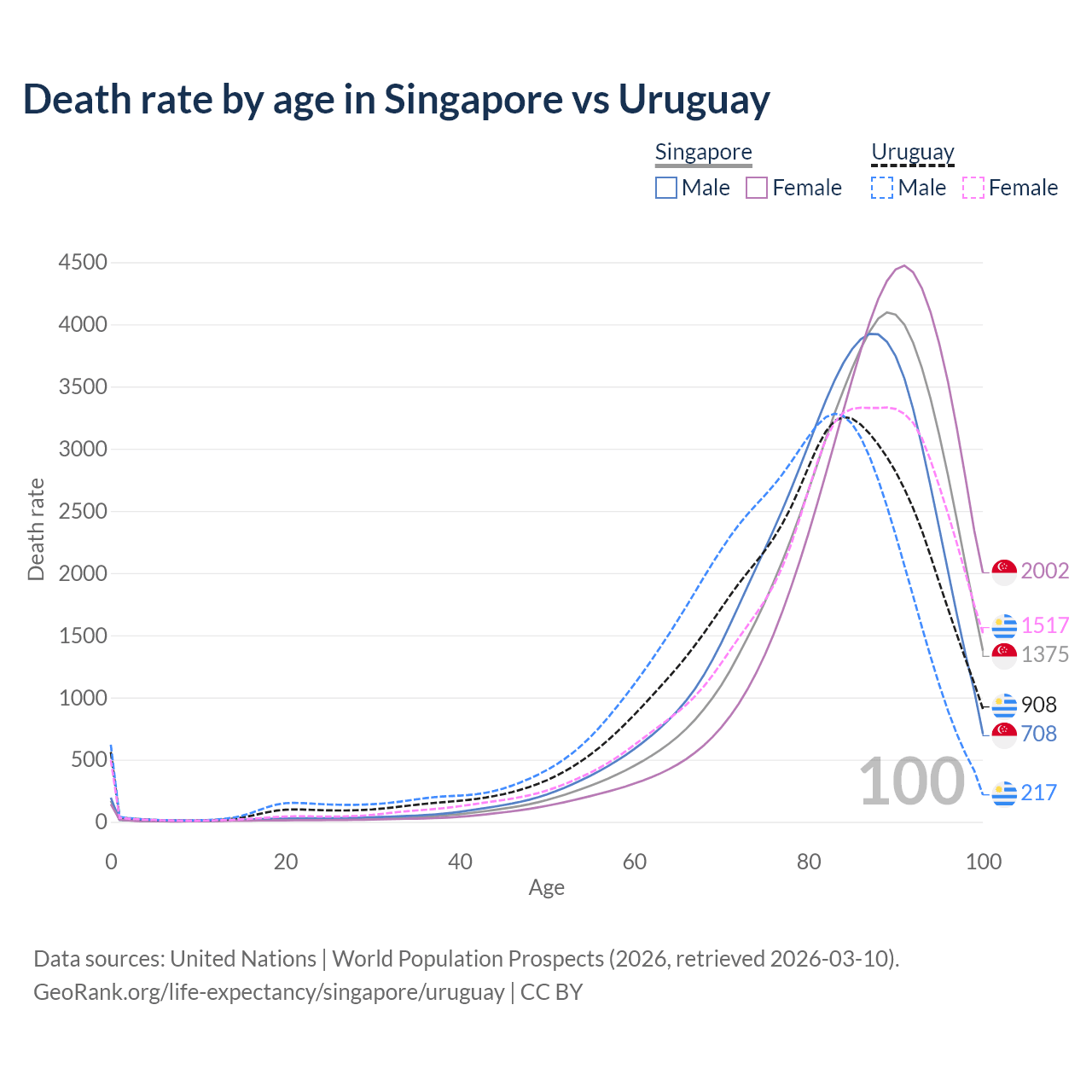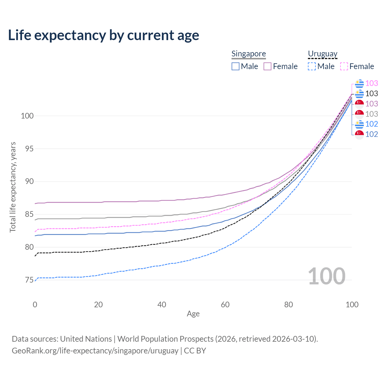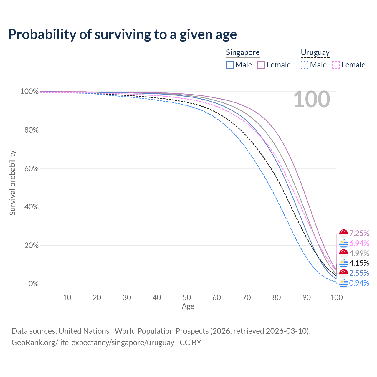 This life expectancy calculator shows the odds of living to 100, 95, 90, and below based on current age for both males and females in Singapore and Uruguay, along with mean and median age of death. The calculations are based on the 2026 life tables (actuarial tables) from the UN World Population Prospects.