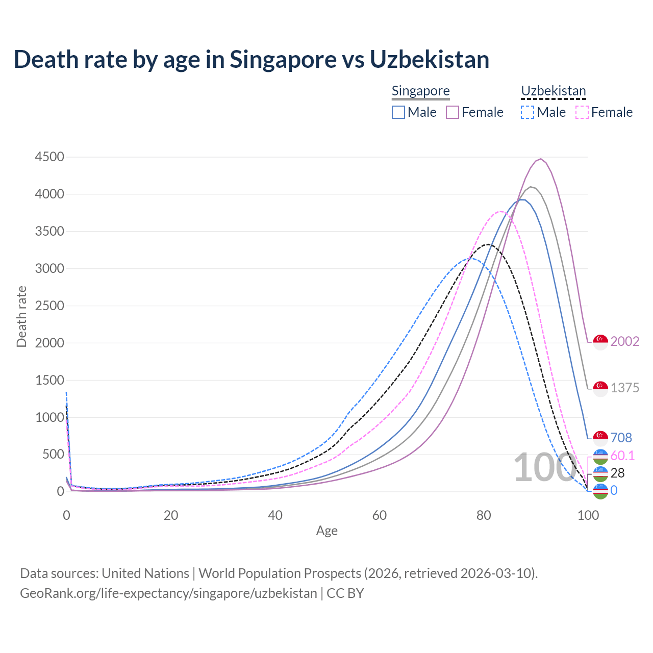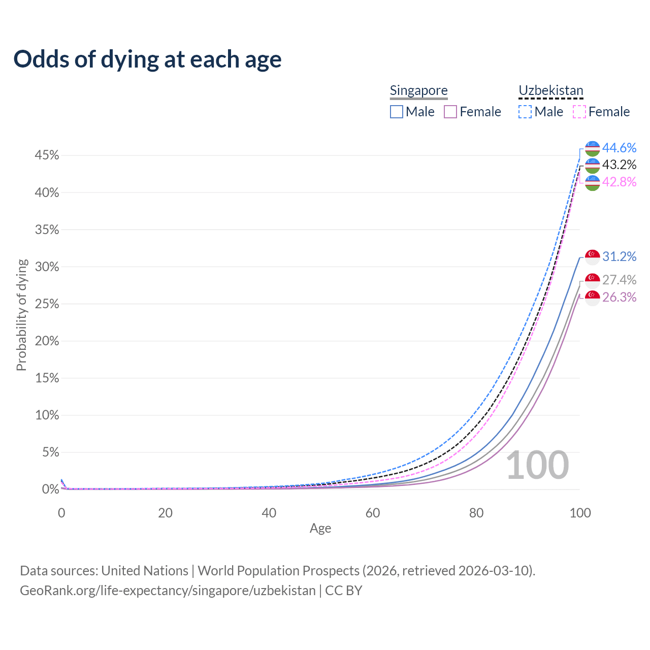 This life expectancy calculator shows the odds of living to 100, 95, 90, and below based on current age for both males and females in Singapore and Uzbekistan, along with mean and median age of death. The calculations are based on the 2026 life tables (actuarial tables) from the UN World Population Prospects.