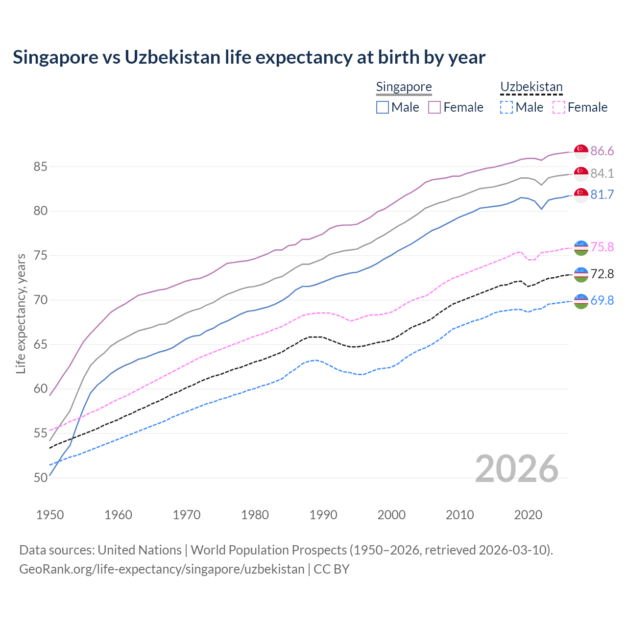 The average life expectancy at birth is 84.1 years in Singapore vs 72.8 in Uzbekistan. Singapore is ranked 9/197 by life expectancy, and Uzbekistan is 115/197. In Singapore, the life expectancy is 81.7 years for males and 86.6 years for females. In Uzbekistan, it's 69.8 years for males and 75.8 years for females.