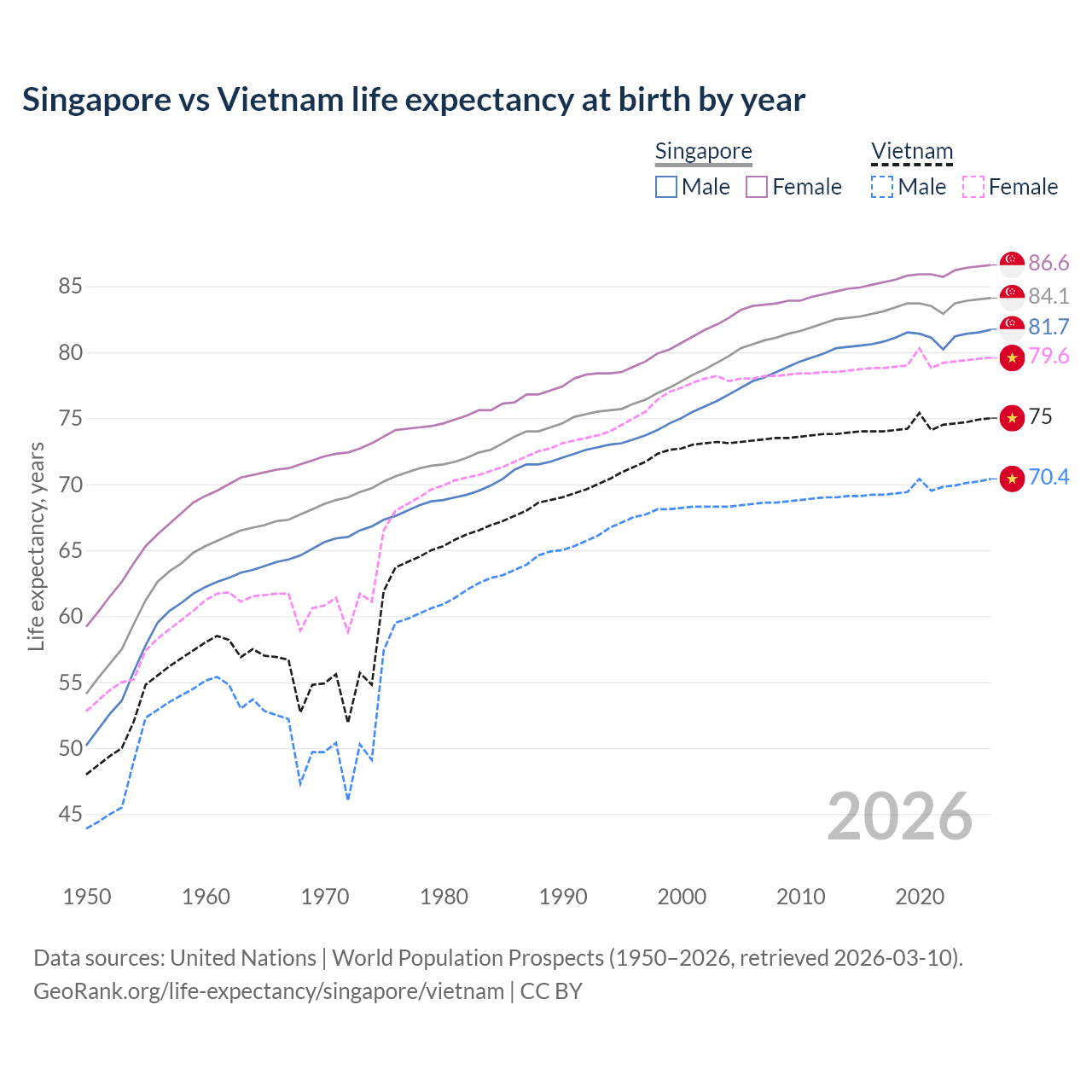 The average life expectancy at birth is 84.1 years in Singapore vs 75 in Vietnam. Singapore is ranked 9/197 by life expectancy, and Vietnam is 93/197. In Singapore, the life expectancy is 81.7 years for males and 86.6 years for females. In Vietnam, it's 70.4 years for males and 79.6 years for females.