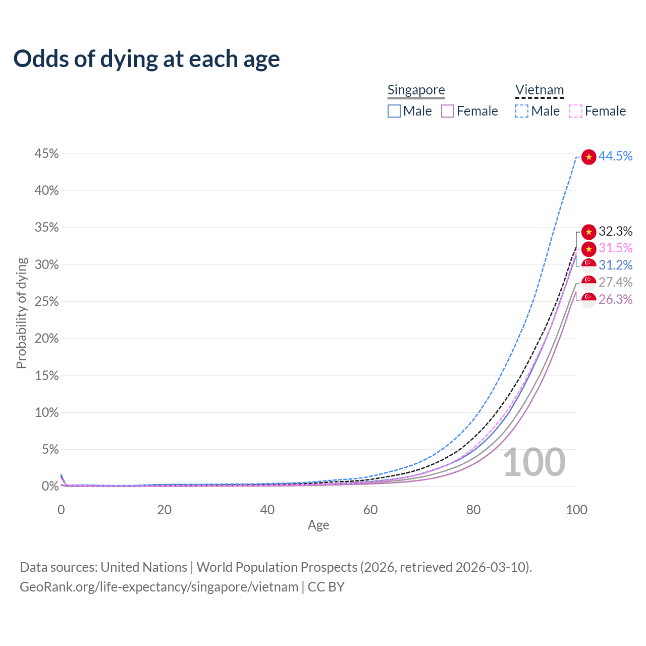 This life expectancy calculator shows the odds of living to 100, 95, 90, and below based on current age for both males and females in Singapore and Vietnam, along with mean and median age of death. The calculations are based on the 2026 life tables (actuarial tables) from the UN World Population Prospects.