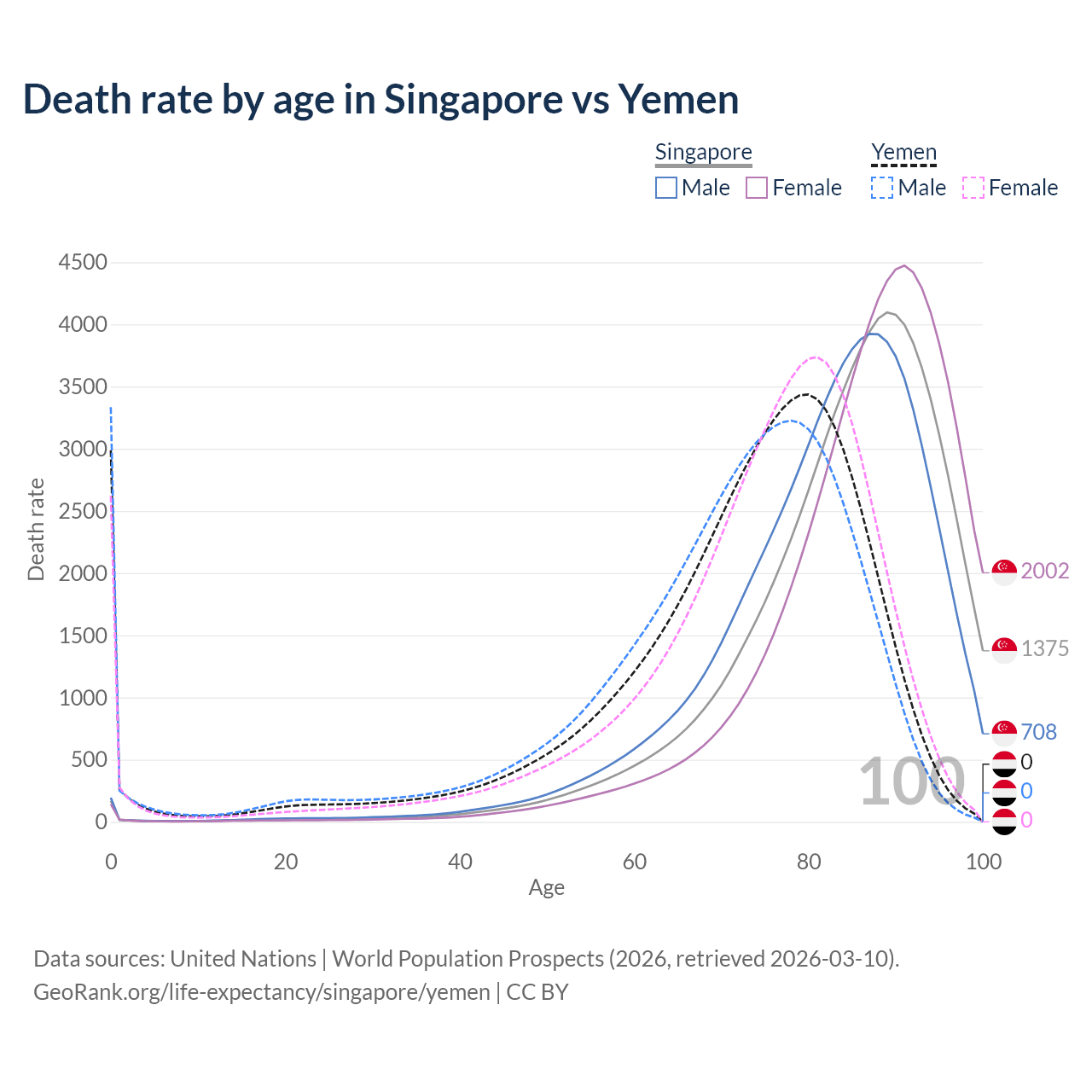 The average life expectancy at birth is 84.1 years in Singapore vs 69.7 in Yemen. Singapore is ranked 9/197 by life expectancy, and Yemen is 138/197. In Singapore, the life expectancy is 81.7 years for males and 86.6 years for females. In Yemen, it's 67.6 years for males and 71.9 years for females.