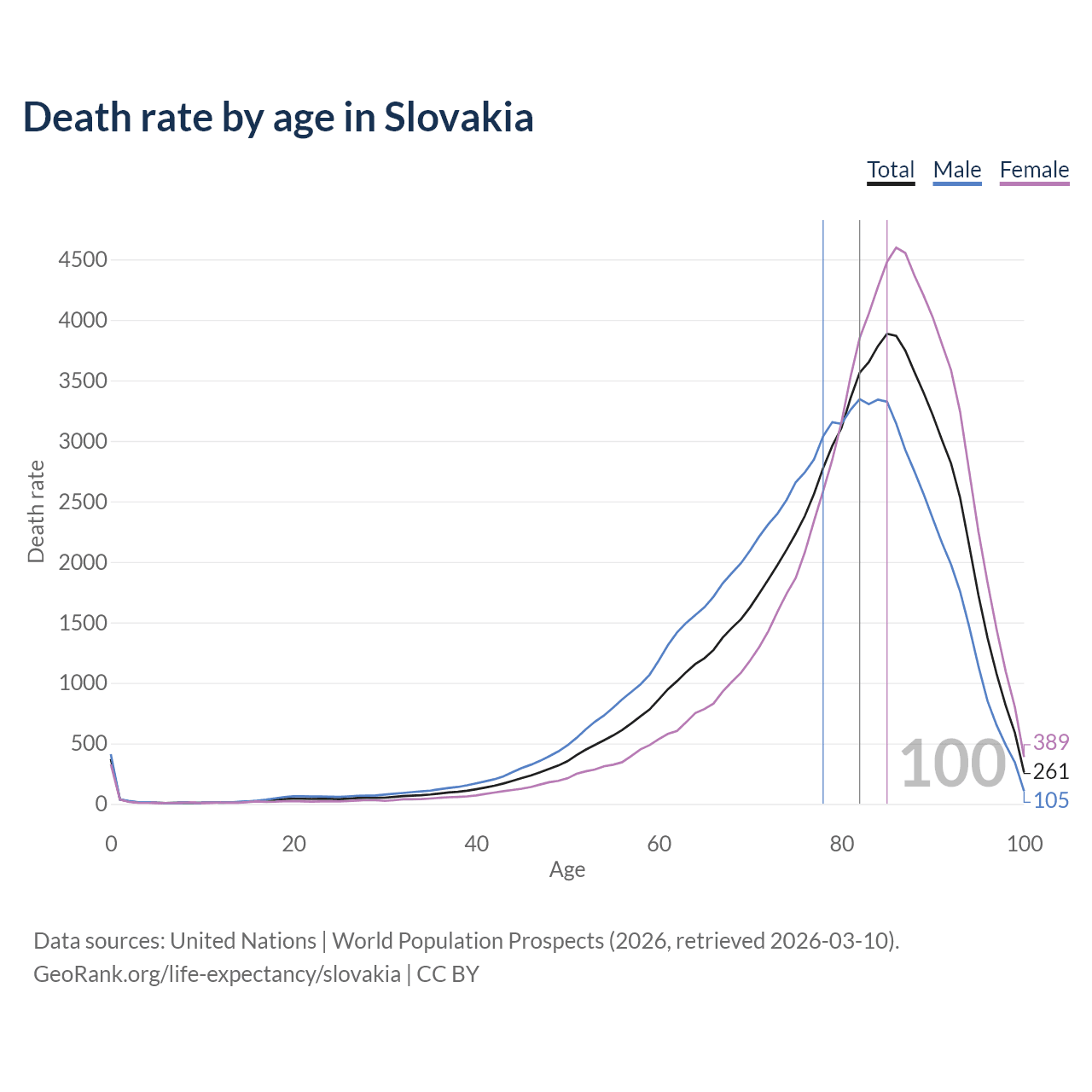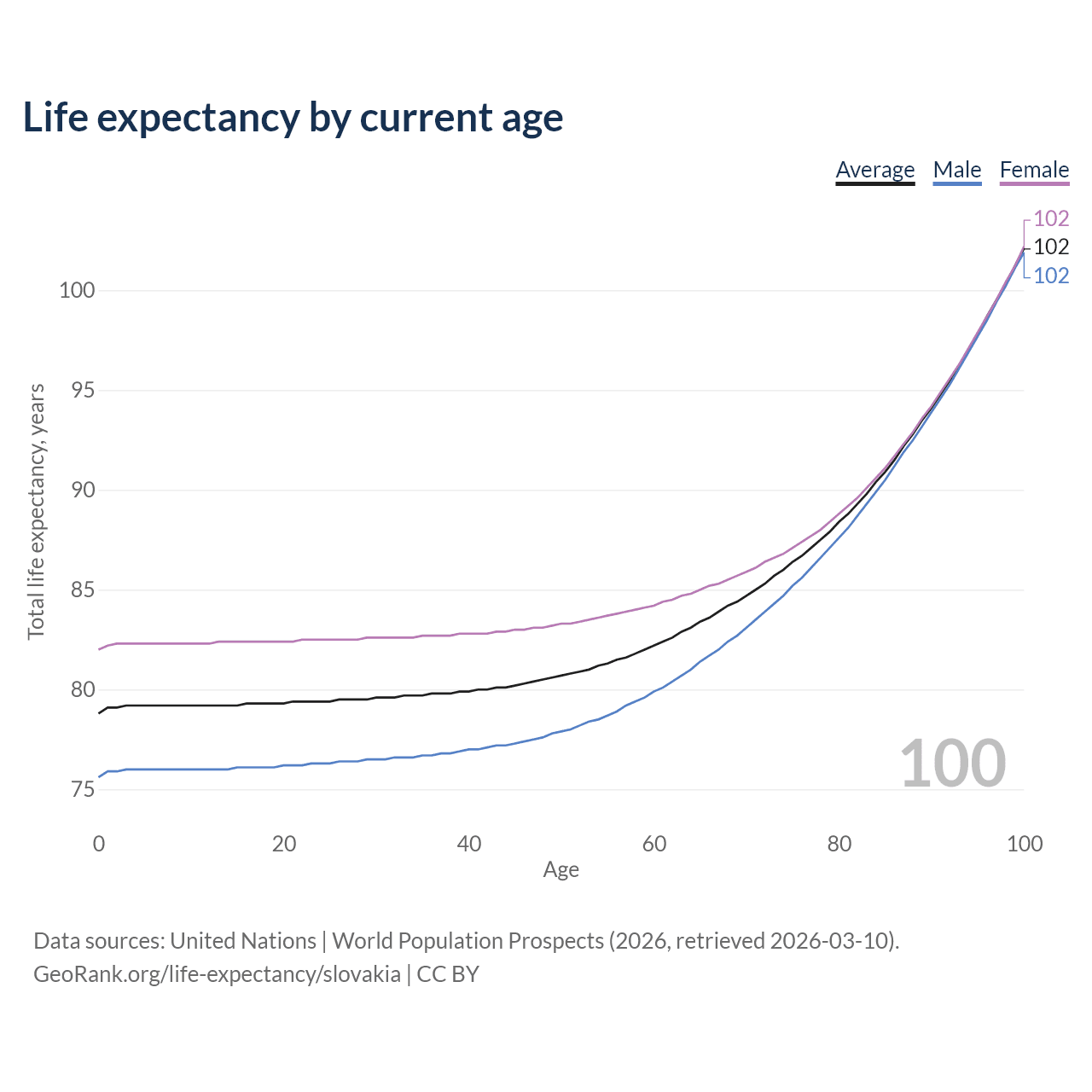 This life expectancy calculator shows the odds of living to 100, 95, 90, and below based on current age for both males and females in Slovakia, along with mean and median age of death. The calculations are based on the 2026 life tables (actuarial tables) from the UN World Population Prospects.