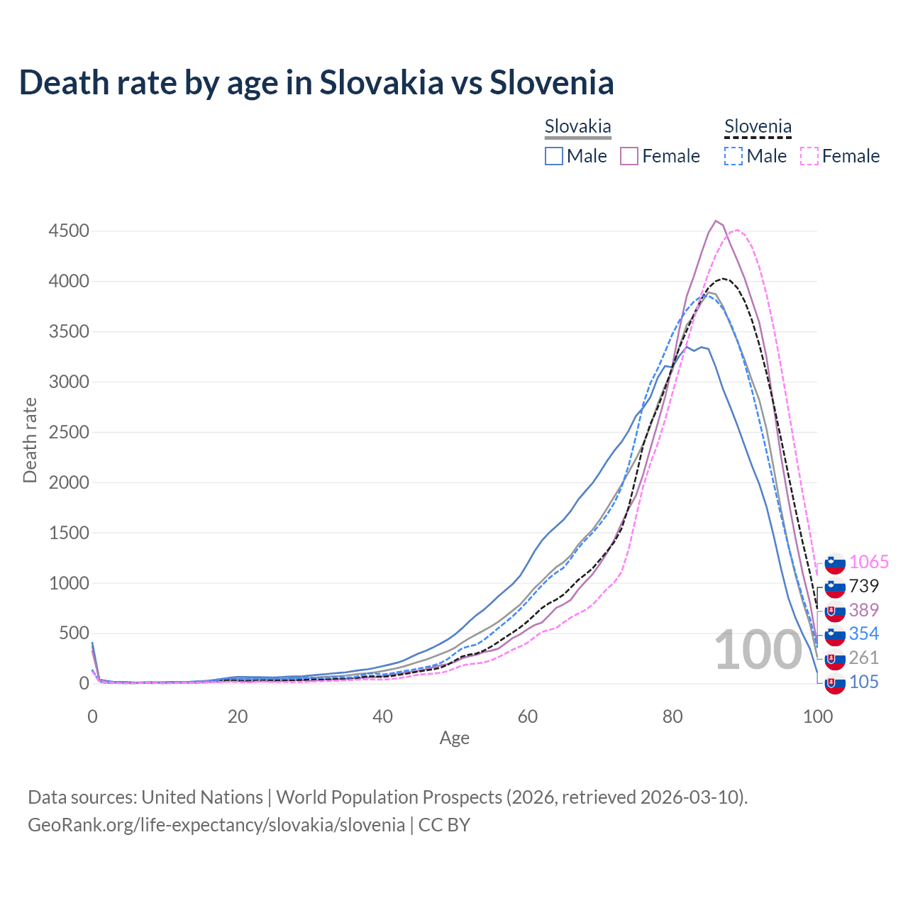 In Slovakia, the most common age of death is 85, compared to 87 in Slovenia. The median age of death is 82 in Slovakia and 84.4 in Slovenia, meaning only half of each cohort is expected to live past that age.