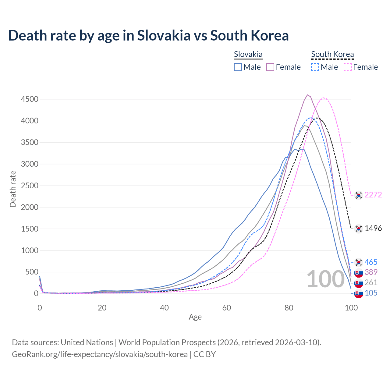 In Slovakia, the most common age of death is 85, compared to 89 in South Korea. The median age of death is 82 in Slovakia and 86.8 in South Korea, meaning only half of each cohort is expected to live past that age.