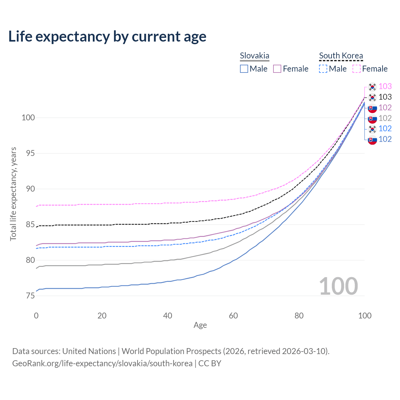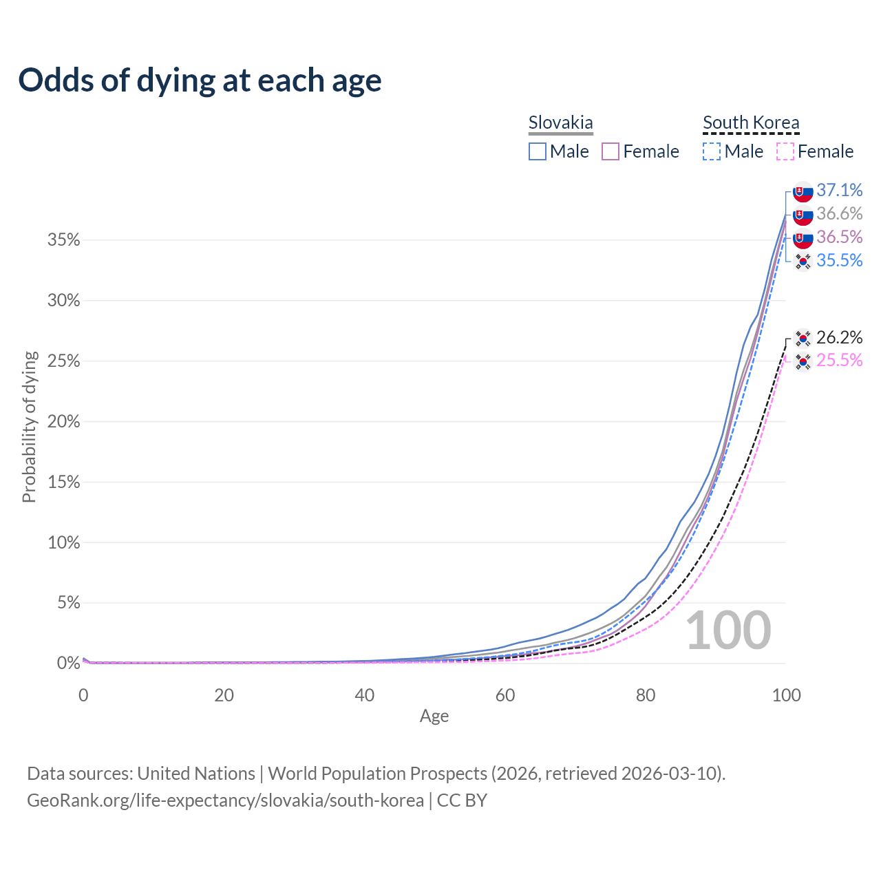 This life expectancy calculator shows the odds of living to 100, 95, 90, and below based on current age for both males and females in Slovakia and South Korea, along with mean and median age of death. The calculations are based on the 2026 life tables (actuarial tables) from the UN World Population Prospects.