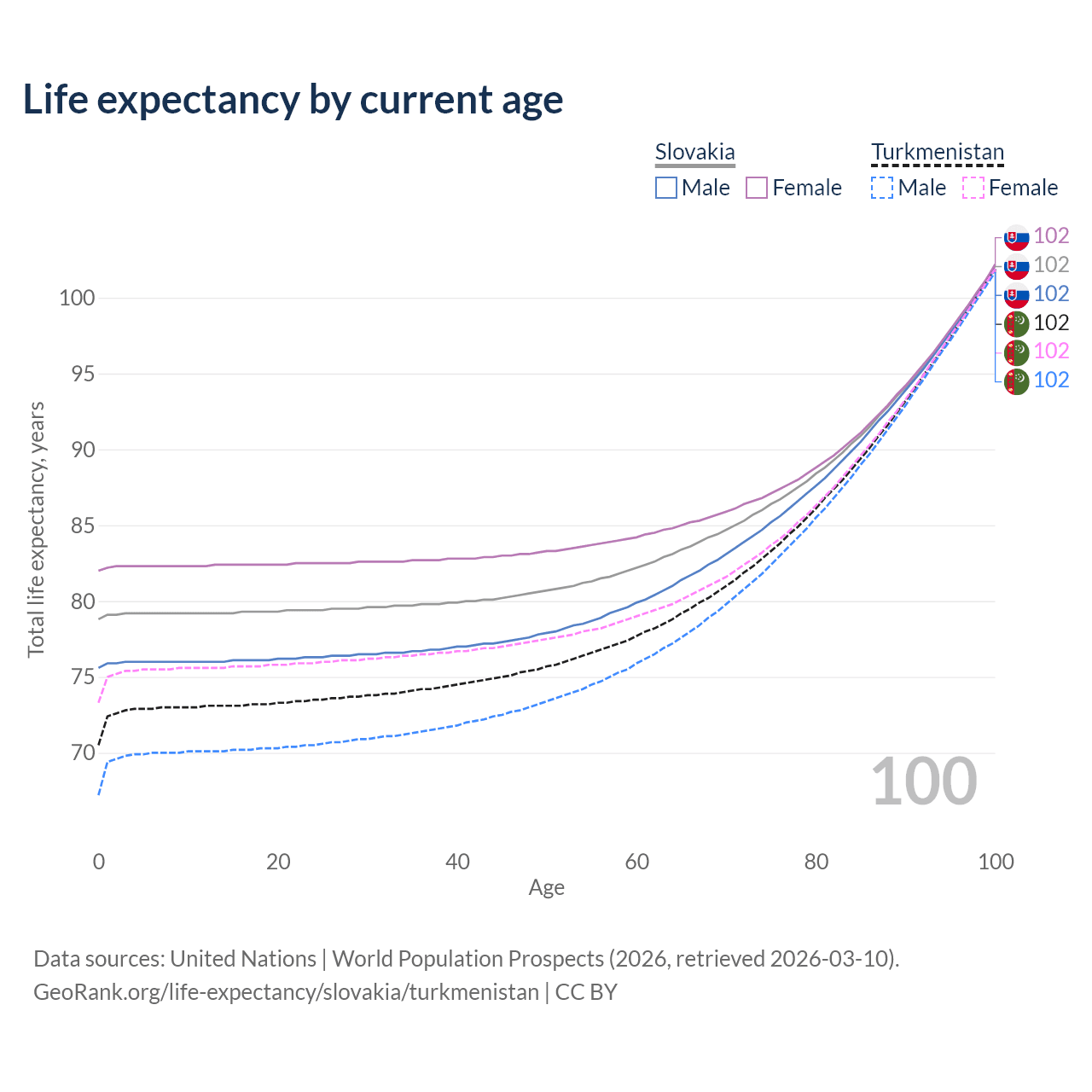 This life expectancy calculator shows the odds of living to 100, 95, 90, and below based on current age for both males and females in Slovakia and Turkmenistan, along with mean and median age of death. The calculations are based on the 2026 life tables (actuarial tables) from the UN World Population Prospects.