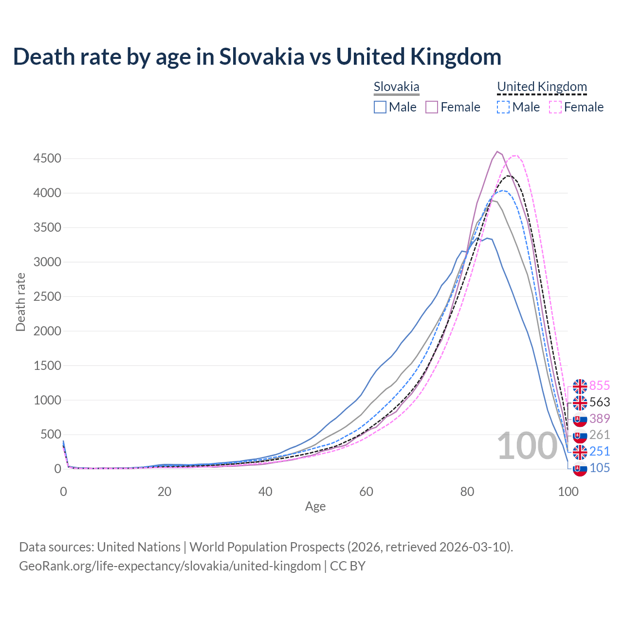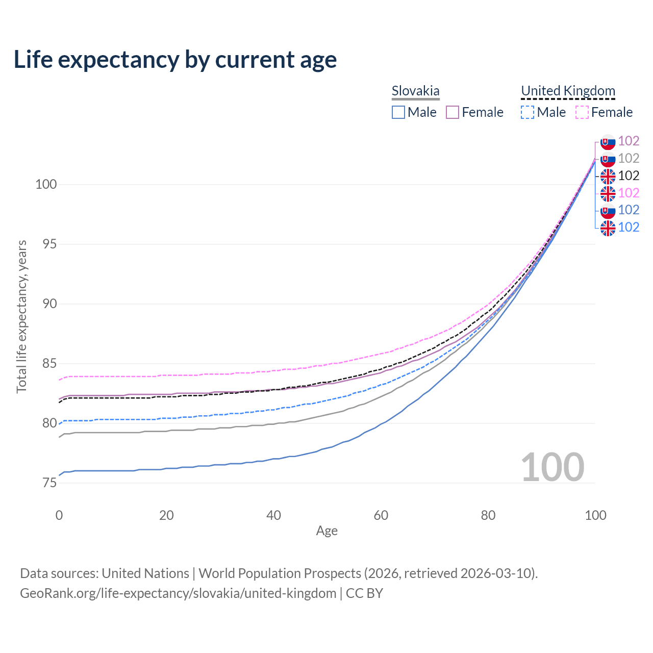 This life expectancy calculator shows the odds of living to 100, 95, 90, and below based on current age for both males and females in Slovakia and the United Kingdom, along with mean and median age of death. The calculations are based on the 2026 life tables (actuarial tables) from the UN World Population Prospects.
