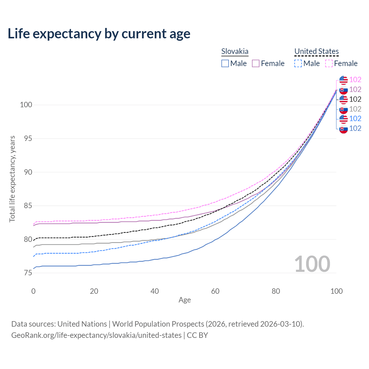 This life expectancy calculator shows the odds of living to 100, 95, 90, and below based on current age for both males and females in Slovakia and the United States, along with mean and median age of death. The calculations are based on the 2026 life tables (actuarial tables) from the UN World Population Prospects.